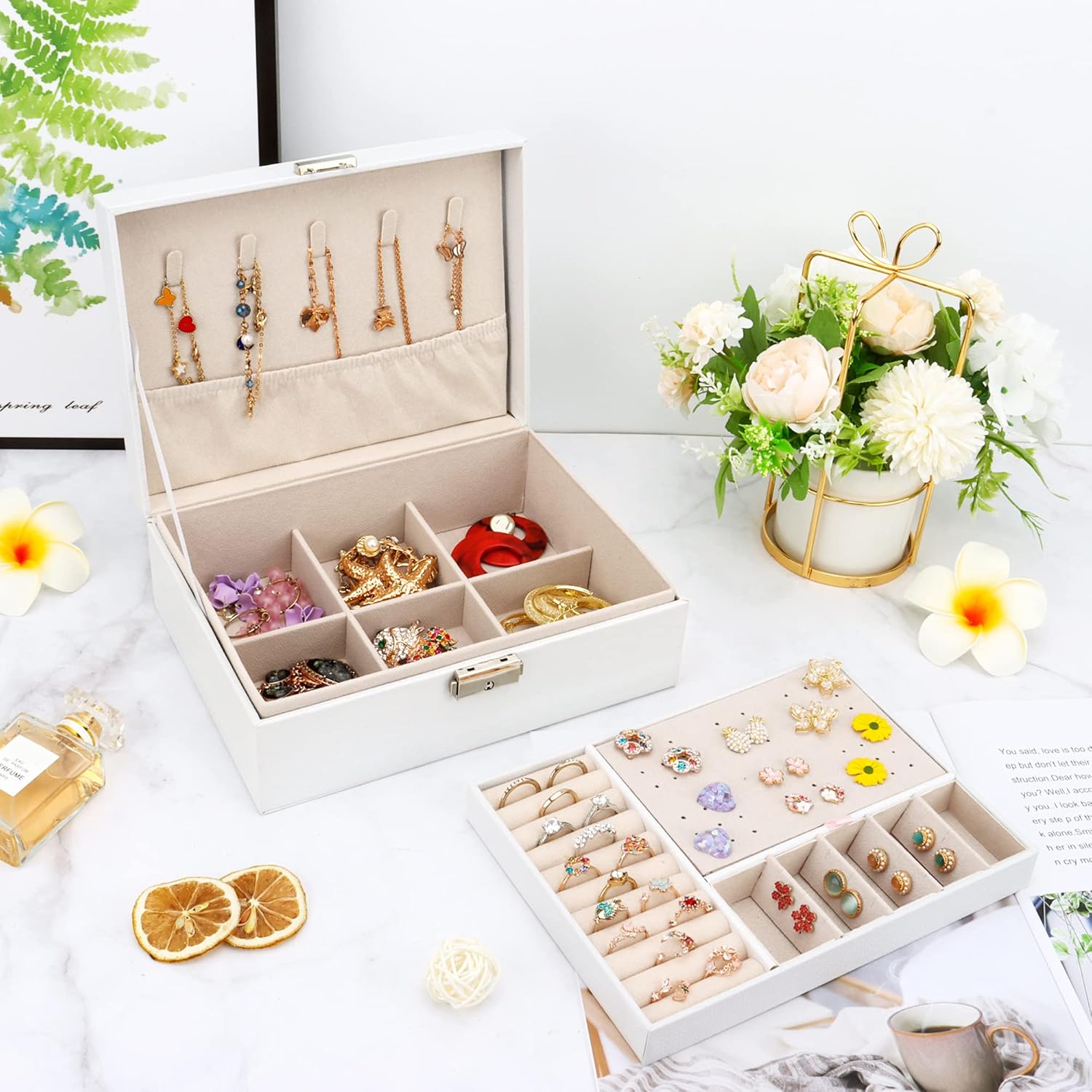 DesignSter Jewelry Box Organizer with Lock-2 Layer PU Leather Jewelry Storage Case Jewelry Holder Display with Removable Tray for Necklace Earrings Rings Bracelets (White)