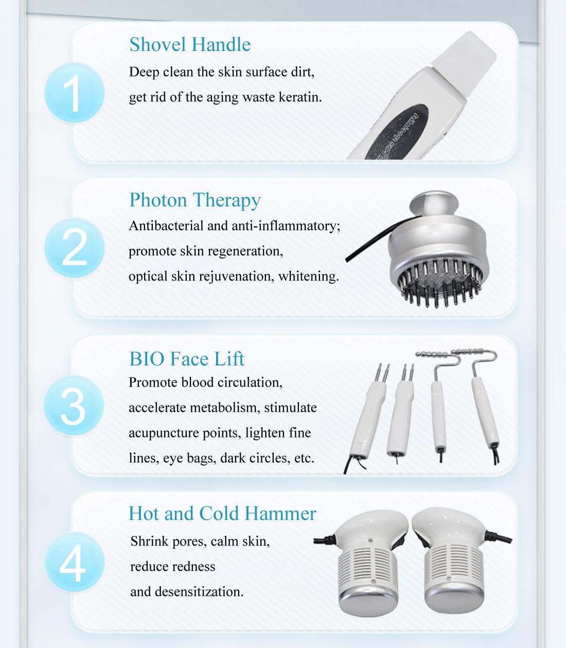 Note: – Before use, choose color according to the skin status. – The unsuitable setting may cause rubefaction on sensitive skin. When this occur, can use the cold side of Hot & Cold Hammer to cool down the area. The rubefaction will disappear in 24 hours. Photon Function can be combined with “MICRO ELECTRIC CURRENT”, which will make the photon function more effective.