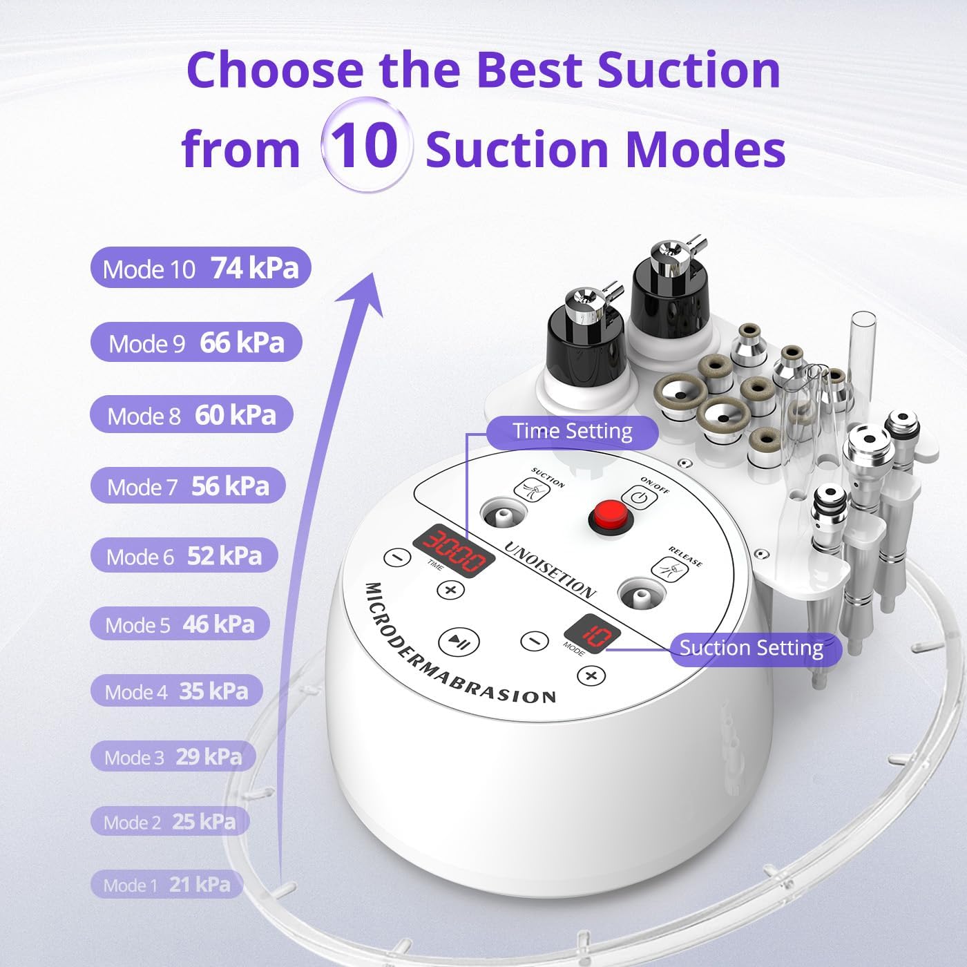 𝗣𝗿𝗲𝗰𝗶𝘀𝗲 𝗦𝘂𝗰𝘁𝗶𝗼𝗻 𝗮𝗻𝗱 𝗧𝗶𝗺𝗲 𝗦𝗲𝘁𝘁𝗶𝗻𝗴: Elevate your skincare routine with UNOISETION upgraded dermabrasion facial machine. It features digital controls for suction and time adjustment, ensuring accuracy and effectiveness. Say goodbye to cumbersome rotary adjustments and welcome the ease of accurate control.