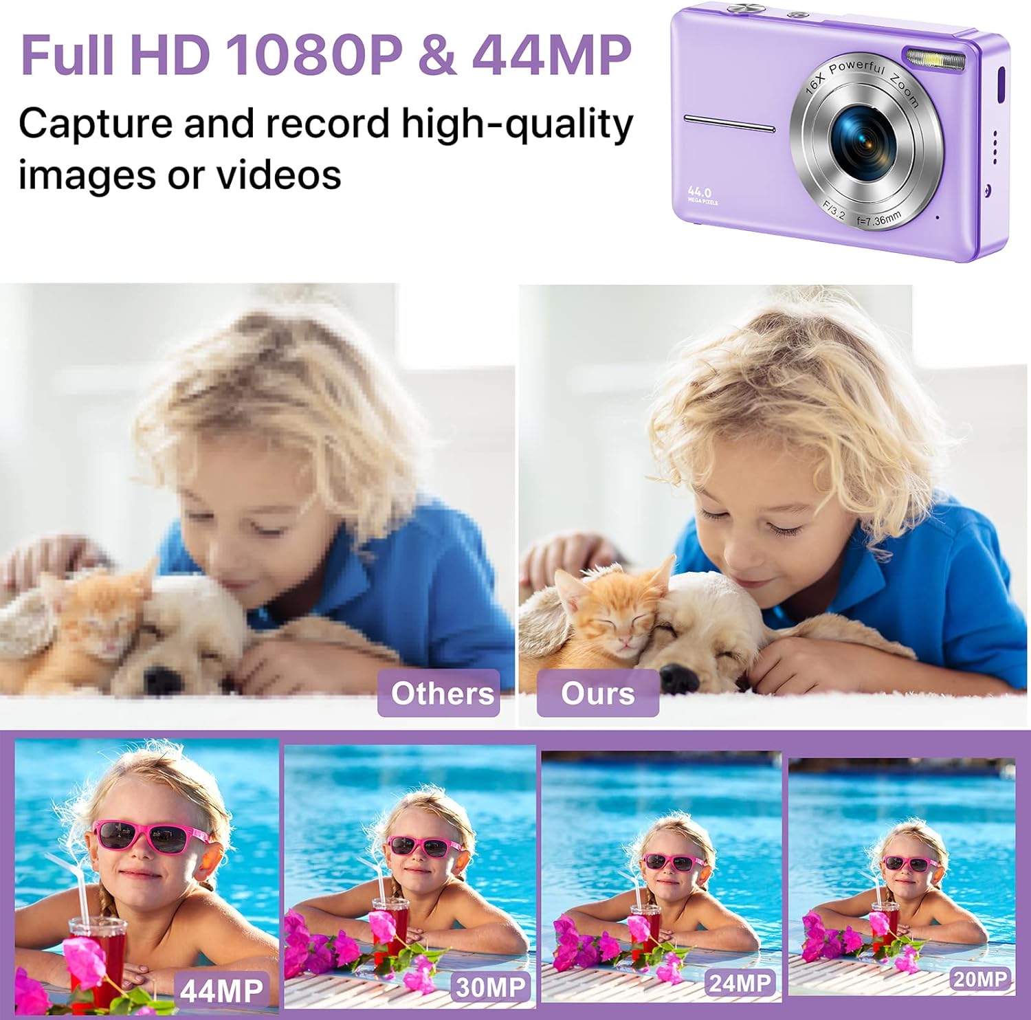 This teens Digital Camera equipped with FHD 1080P video resolution and 44.0 megapixels.This compact digital camera supports 16x digital zoom, you can use the W/T button to zoom in or zoom out the image.