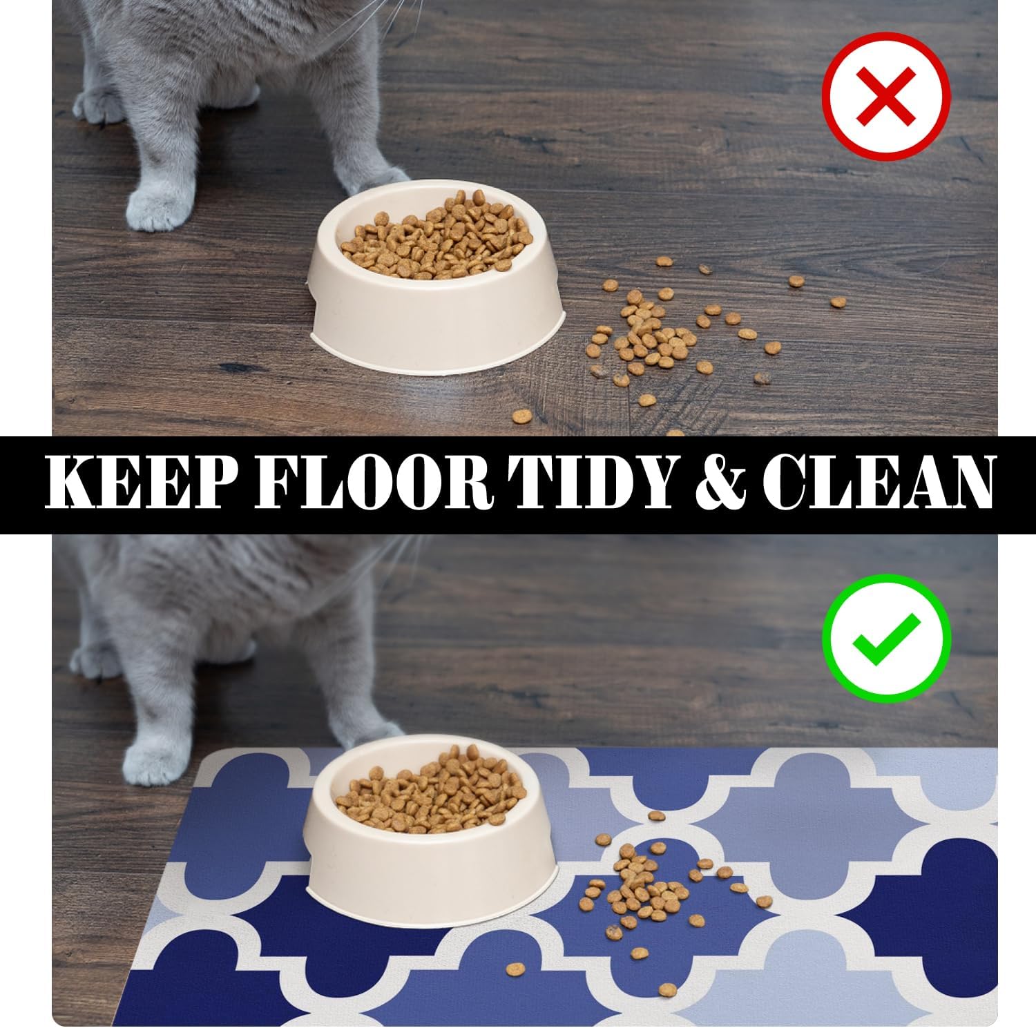 The cat matt for food and water can absorb spilled water without leaving traces and dry quick, avoid wetting pet paws. It’s perfect to use the dog dish mat under automatic feeder, it protect your floor being corroded by spilling water, meanwhile provide your pets a healthy comfortable feeding environment. Most pets would like to sit on the dog food mat made by safe pet-friendly material, which is a great gift for your puppy and animal lovers.