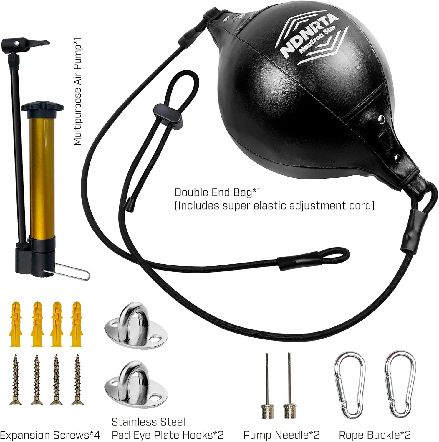 [Quick Installation Kit] For user-friendly installation, the NDNRTA Double end bag provides a high-elastic adjustable cord kit, That can be adjusted according to the user and ceiling height. It is also equipped with high load-bearing stainless steel pad eye plate hook and expansion screws, Include 2 pcs ring locks, 1 pc multipurpose air pump with 2 pcs inflating needles, It can be installed easily anywhere indoor or outdoor you want.