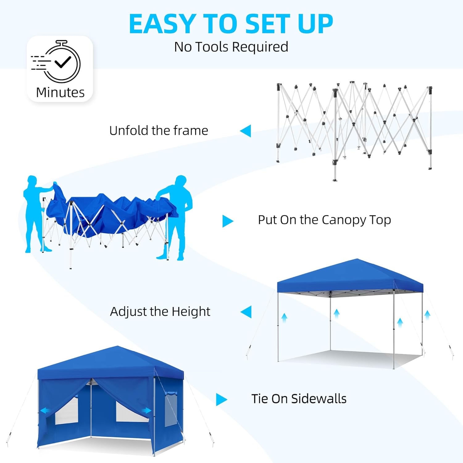 Quick & easy setup & take down: Our 10×10 canopy tent with sidewalls can be set up in just 5 minutes with no tools needed. With four simple steps, stretch the frame legs, attach the canopy top, adjust the height with a press of a button to your preferred canopy height and finally tie the sidewalls