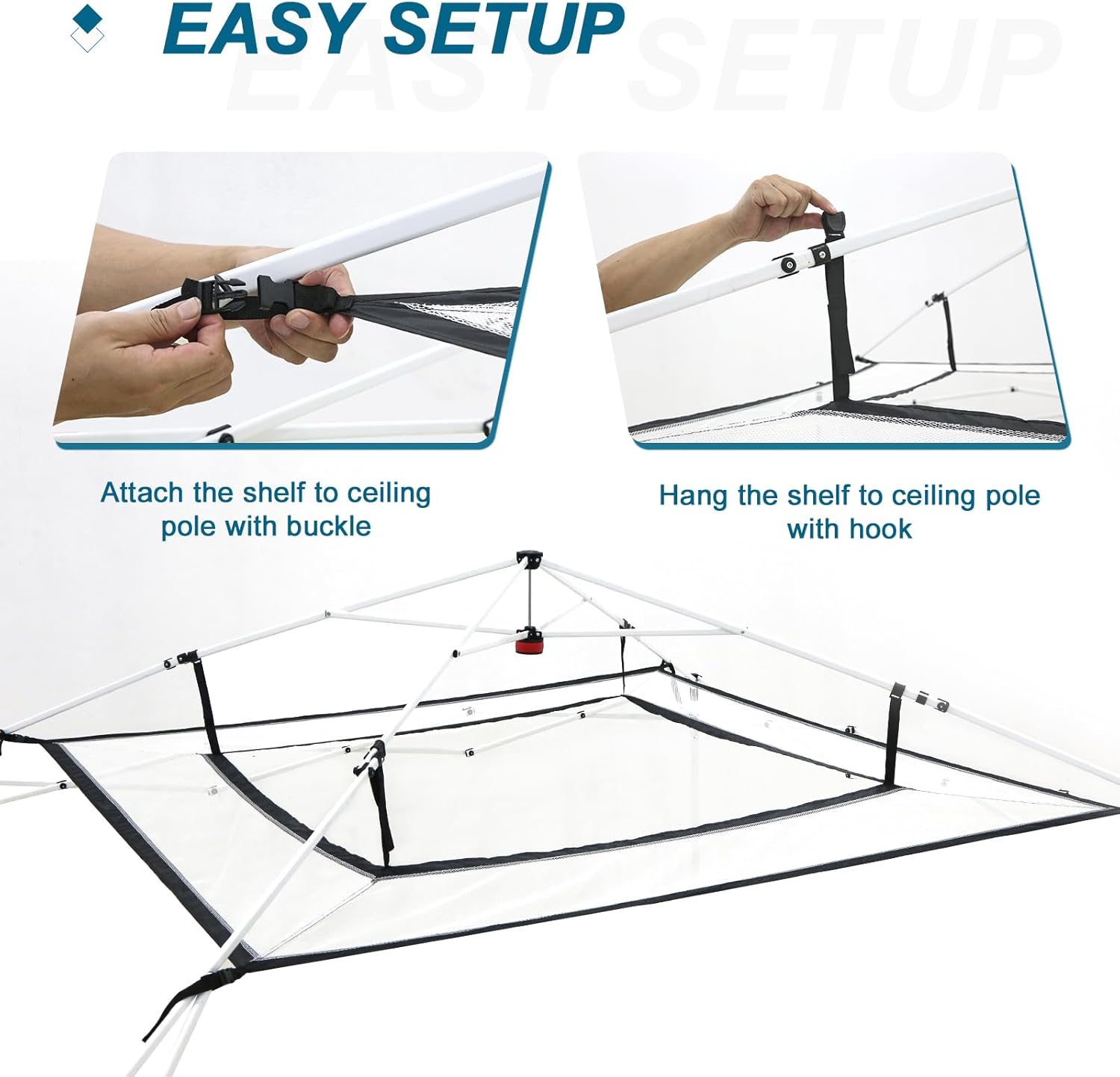 EASY SETUP: Effortlessly attach the mesh shelf to the canopy frame using the convenient built-in hooks.