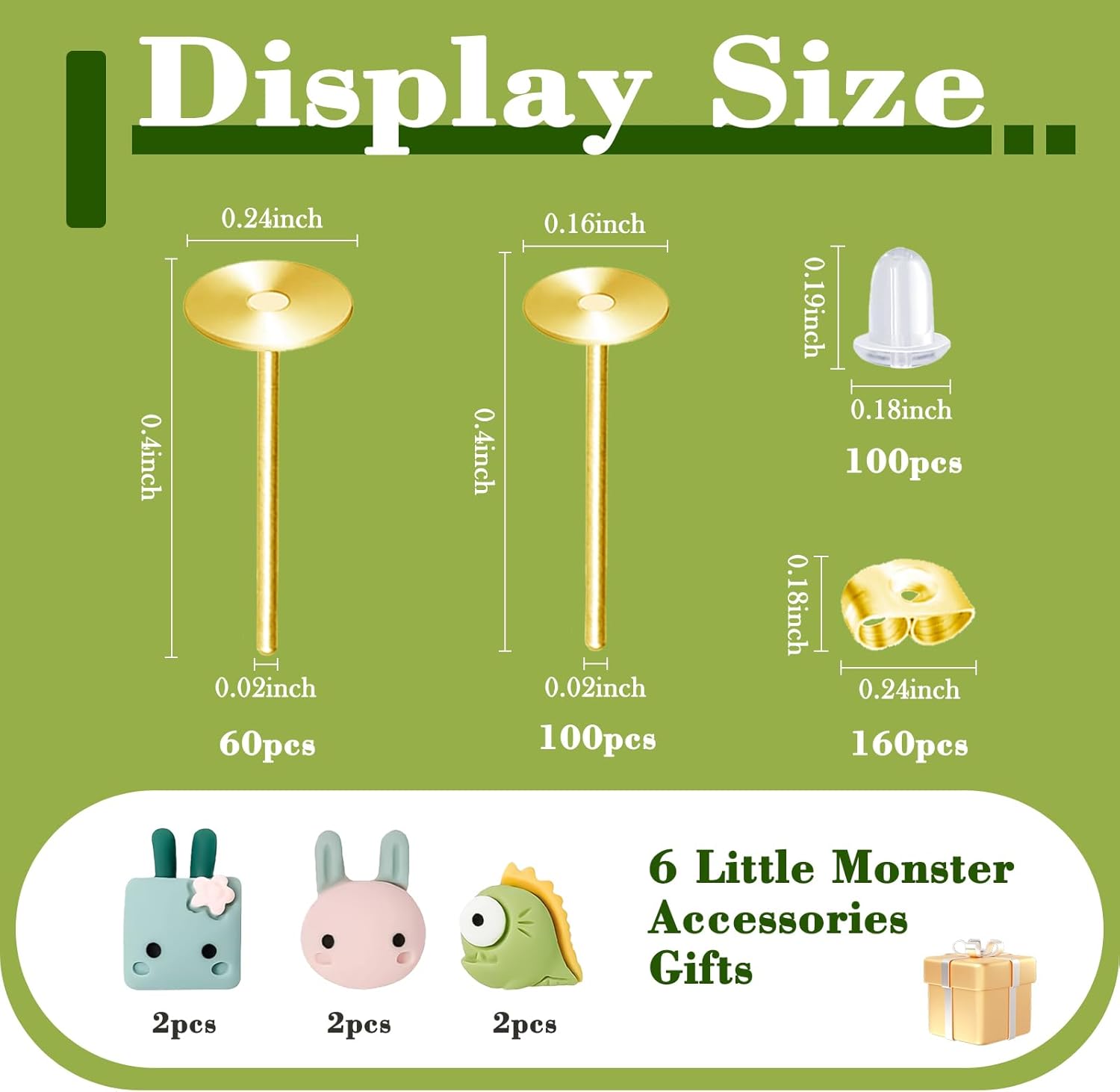 Earring set: You will receive 60pcs 0.24 inch earring posts, 100pcs 0.16 inch earring posts, 160pcs butterfly ear plugs, 100pcs silicone ear plugs, 6pcs small monster accessories to meet your various needs.