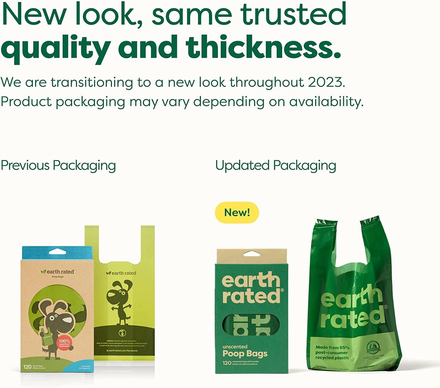 Earth Rated Dog Poop Bags with Handles, Extra Wide, Easy Tie and Guaranteed Leakproof, Unscented, 120 Handle Bags