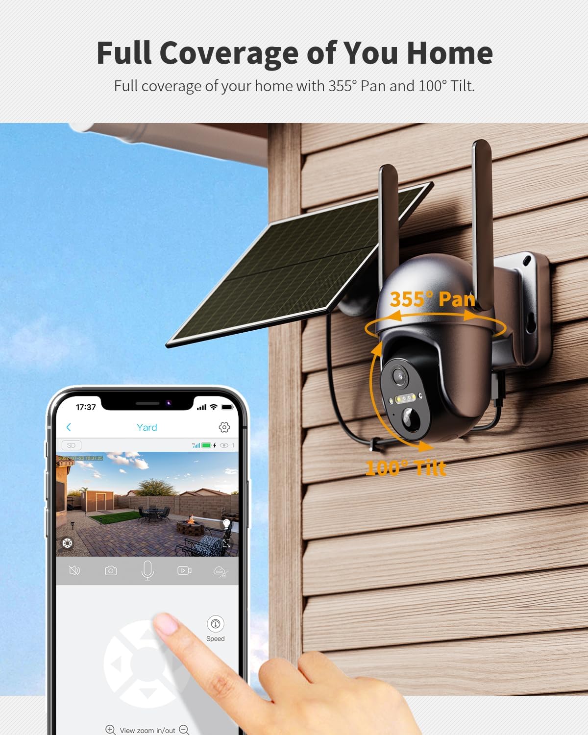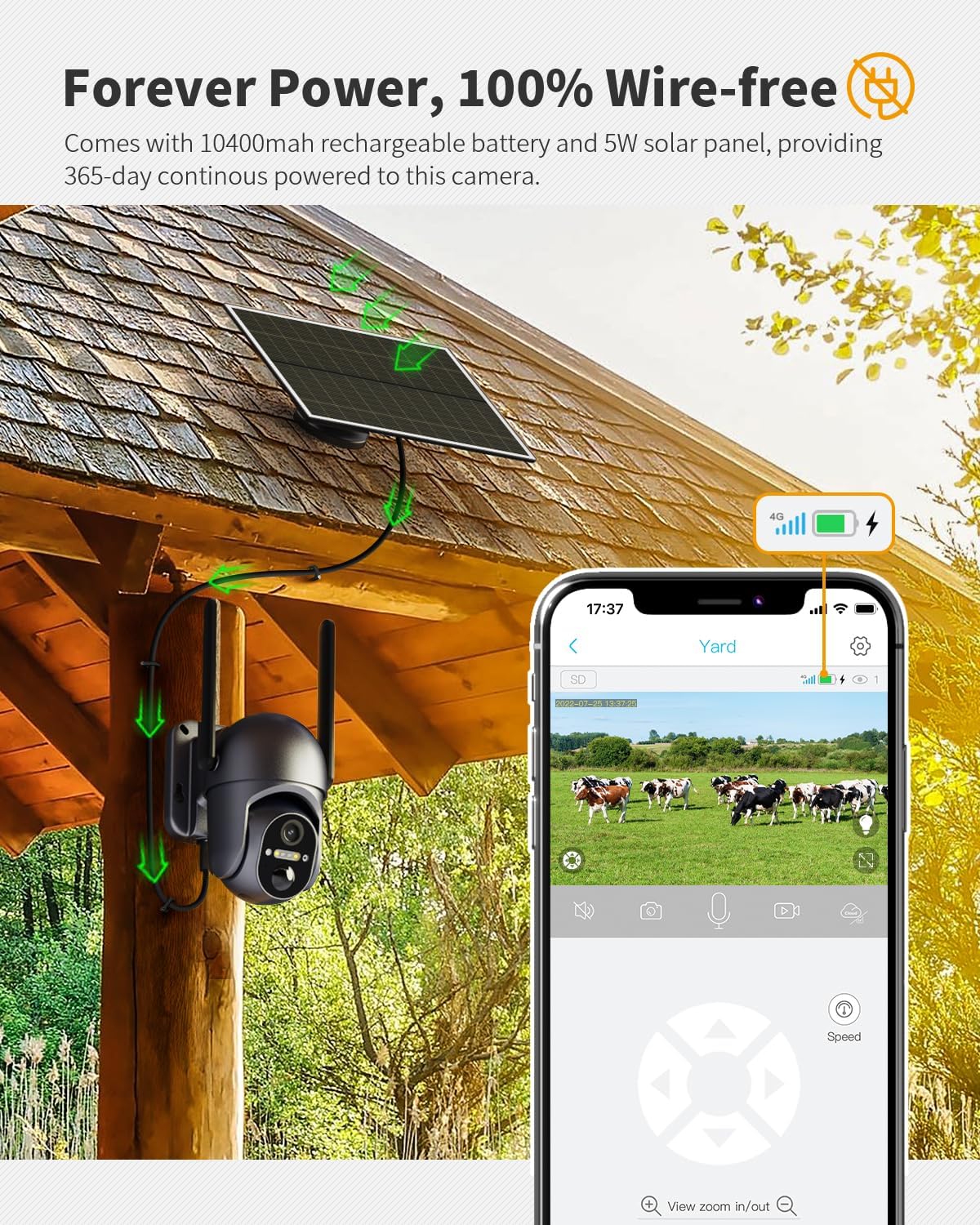 【Remote Phone App Access & 2K Live Video View】With a built-in spotlight and advanced image sensor, this 4g security camera captures 2K photos and videos day/night. Through a 4G network, 355 pan, 100 tilt, and 4x digital zoom, even if you are out of farm/jobsite, you can remotely access this cellular camera via your phone to have a real-time full view of your property.