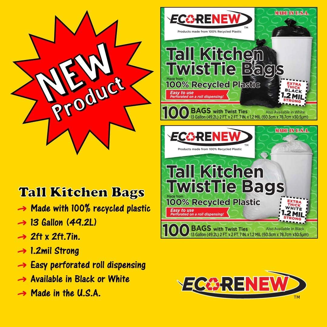 Eco Renew Tall Kitchen Trash Bags with Twist Ties, 13 Gallon Capacity, 1.2 Mil Extra Thick Recycled Plastic Garbage Bags, Home Kitchen and Office Use, Eco-Friendly (White)