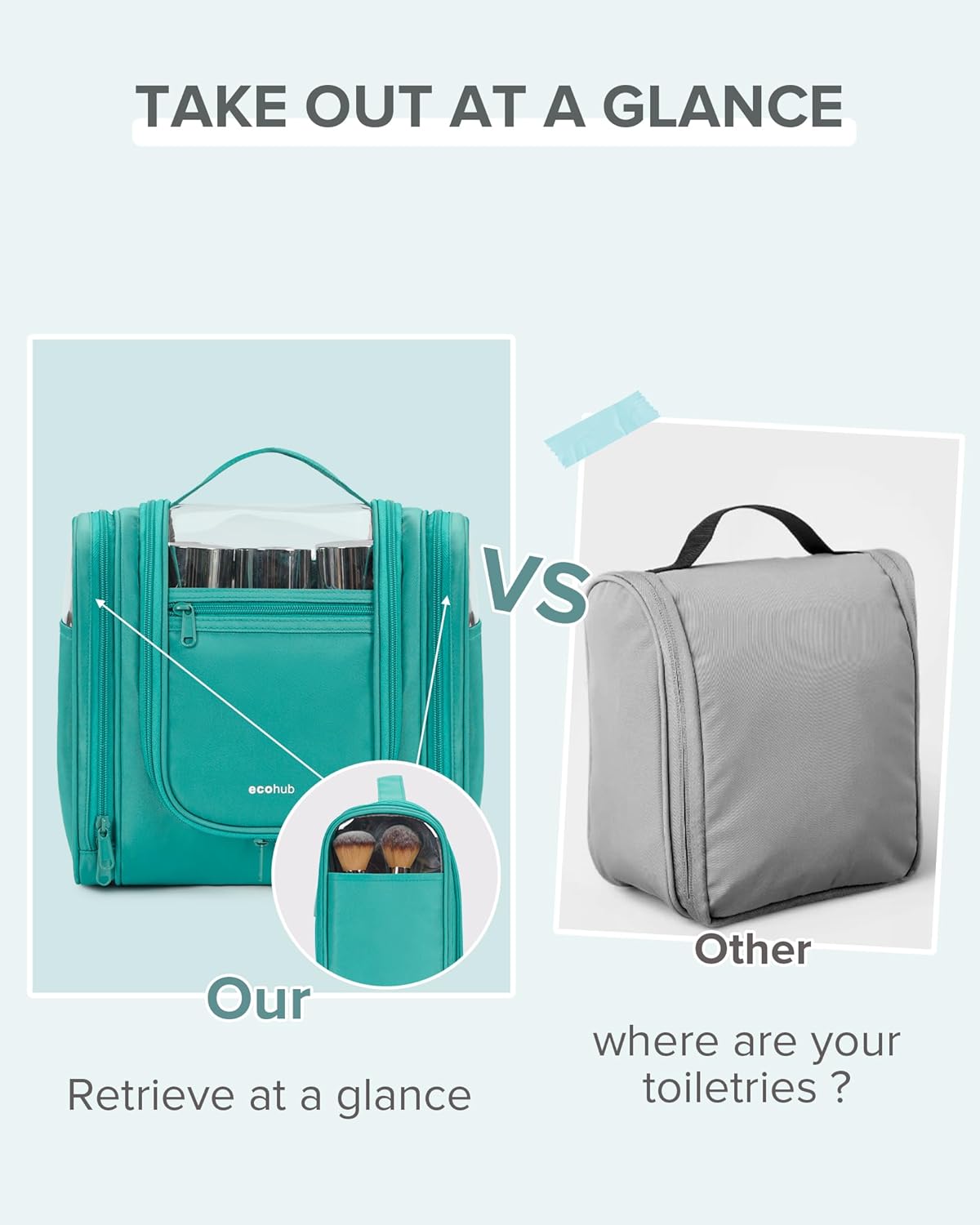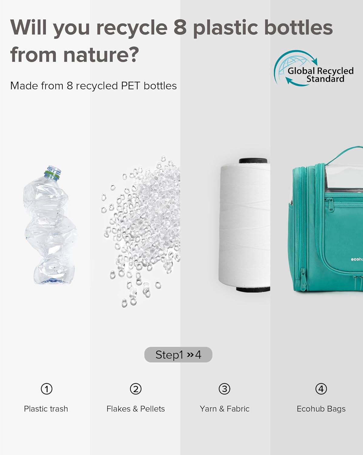 【Sustainable and guarantee】: ECOHUB toiletry bag is 100% eco-friendly because it is made from 8 PLASTIC PET bottles! The water-resistant, lightweight fabric is GRS-certified. Featuring a built-in large metal hook, the clear makeup bag hangs effortlessly from shower shelves, towel racks, or any suitable surface. Your satisfaction is our priority, ensuring a worry-free shopping experience. Reach out to us with any needs or inquiries—we’re here for you! (PATENT PENDING)
