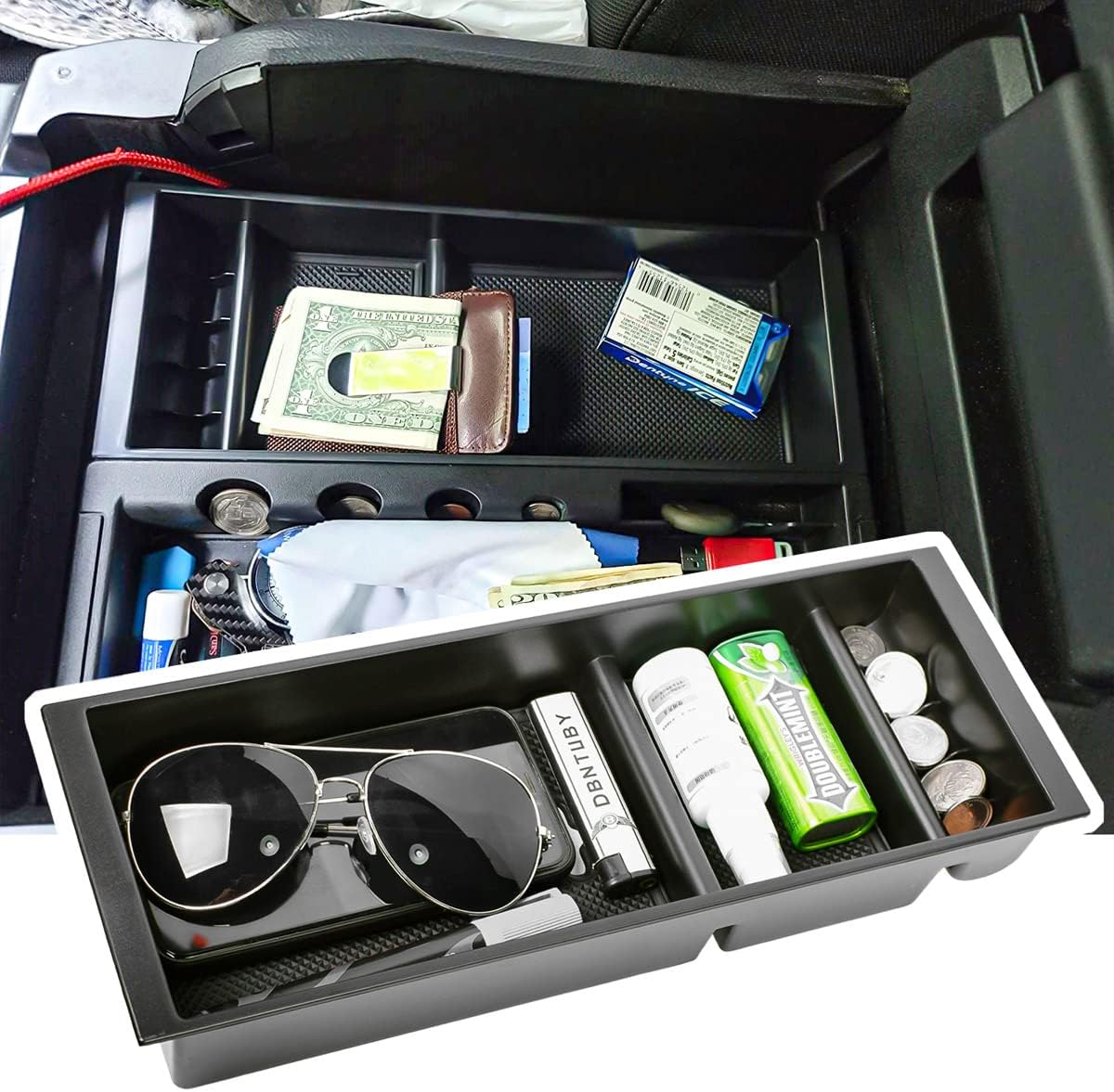 Armrest box of this car is too deep and items in it are usually placed in disorder. This organizer tray can expand the capacity of armrest box and make your items more orderly. Organize the items at the bottom of the center console, and easily remove and put back. Is a very needed accessory