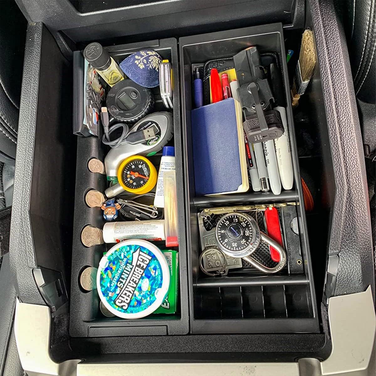 This truck console tray Divide the armrest box into upper and lower layers, increase the storage space. The upper layer can put phone, wallet, sunglasses, watch, and coins, and the lower layer can put repair tools and other gadgets organized properly. Easy to organize and store items. Coin Holder provides you with ready access to your change. a convenient hole through the middle of the organizer it can be used as a USB hole for charging cable.