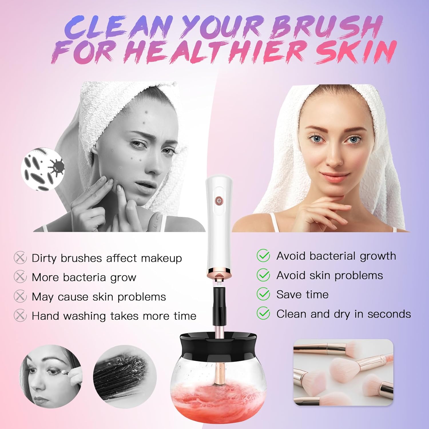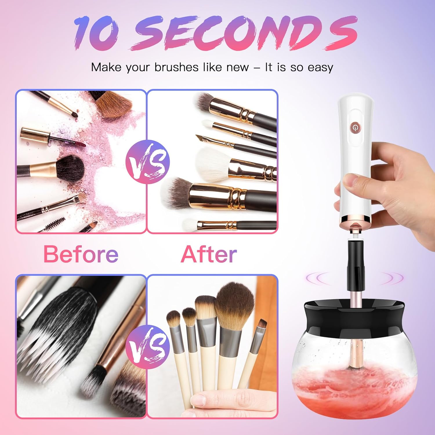 Clean and Dry 2 in 1- With this makeup brush cleaner machine, you don’t need to clean makeup brushes with your hands. Clean your brushes and dry them in less than a minute.