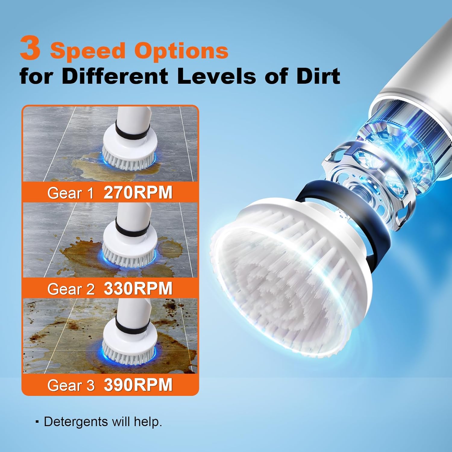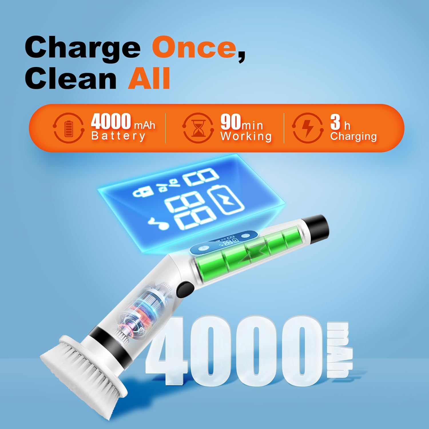 【4000mAh Battery & Cordless Design】Built in a 4000mAh lithium battery, this electric cleaning brush offers a runtime of up to 90min. With a single charge, it can complete all cleaning tasks. Cordless design allows for use anytime and anywhere.