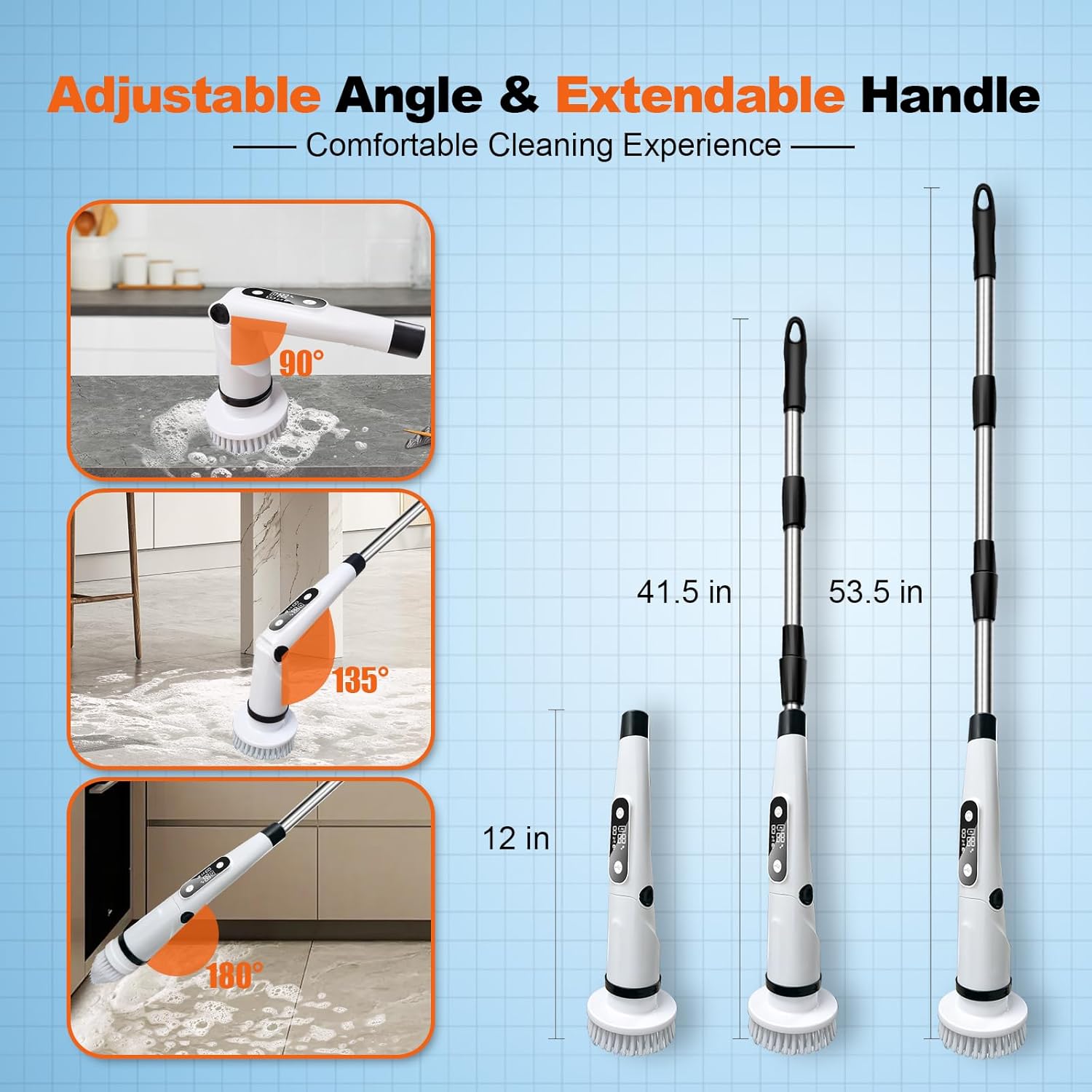 【Extendable Handle & Adjustable Head Angle】This spin scrubber features 2 extendable stainless steel handles and 3 adjustable brush head angles (90°, 135°, 180°). The handle extends from 12 inches to 53.5 inches, making it easy to clean any hard-to-reach place.