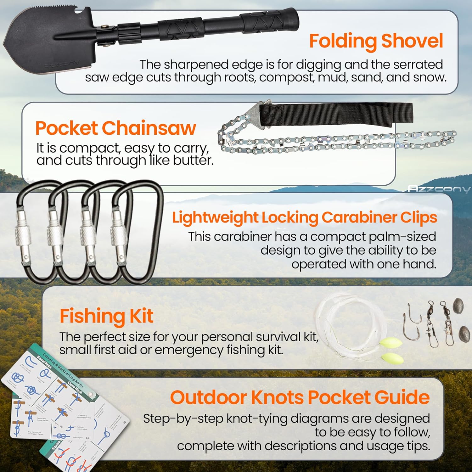 Top Practical Survival Tools: All survival gear in this kit are essential, including a Multifunction Shovel, 12 in 1 Saber Card, 4 in 1 Survival Bracelet, Combat Tourniquet, 1 Set of Fishing Kit, Fire Starter, Modern Compass, Flashlight, Flashlights, Raincoat, Emergency Tent Shelter, First Aid Kit, Professional Wire Saw, Tactical Pen, 2 in 1 Fork & Spoon, 4 Web Dominators, 4 Climbing Hooks and more, which can meet your different needs.