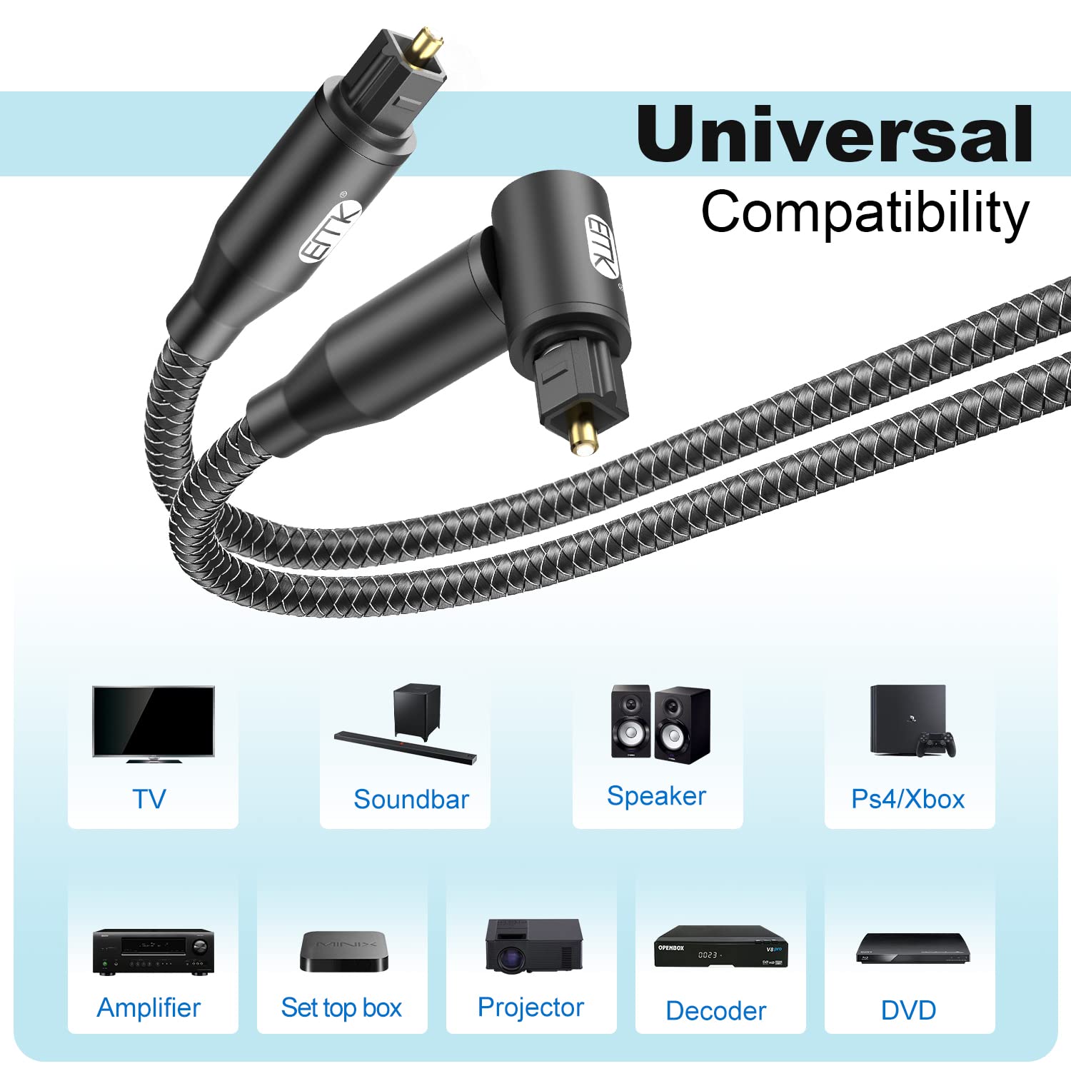Our 90 Degree Toslink Cable is compatible with standard and high-definition devices with Toslink (S/PDIF, optical) ports. Perfect for the soundbar to receiver/preamp, audio processor, DAC, TV and PS4, Playstation, Xbox gaming systems, Blu-ray player, computer, AV receiver, Roku, Xbox One/360, Nintendo Wii, HDTV, monitor, projector, etc.