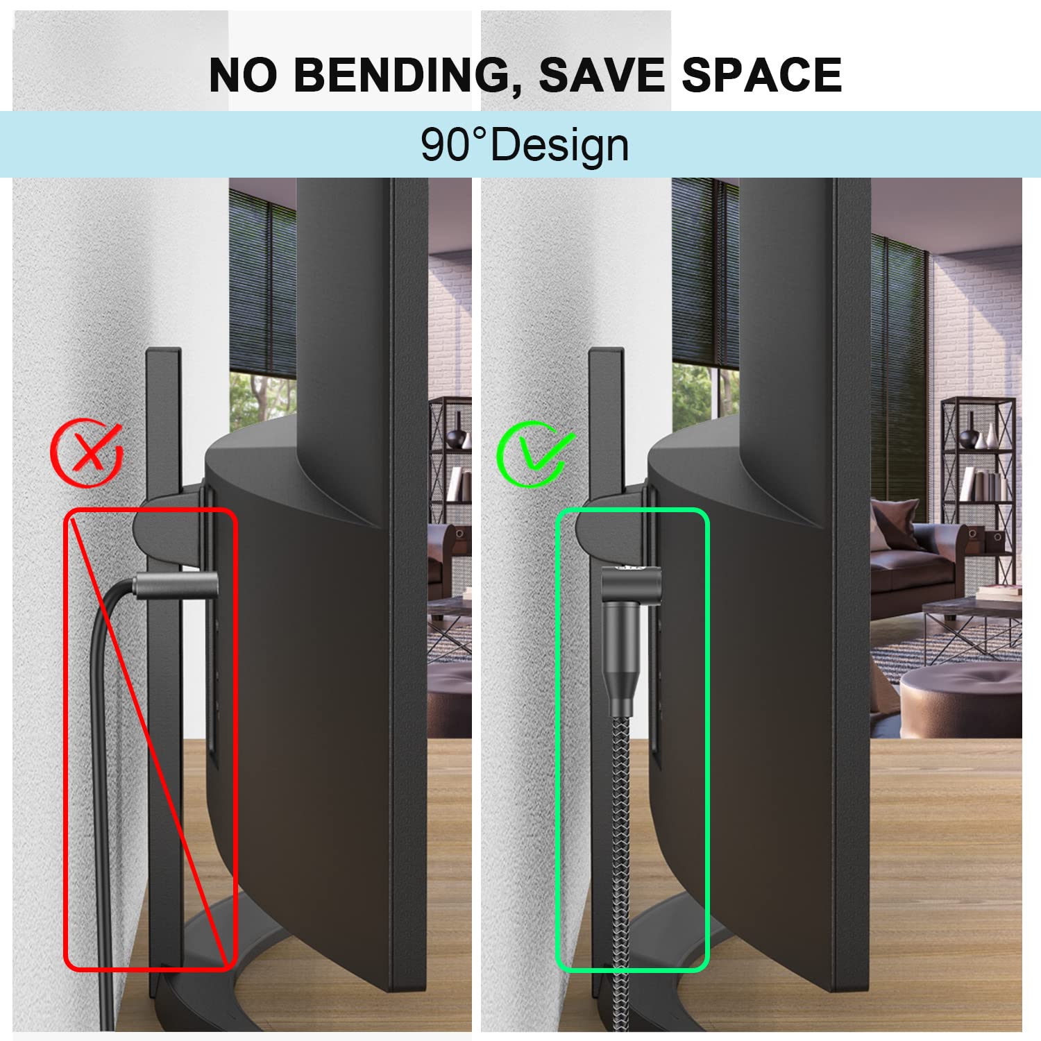 Hi-Fi Sound Transmission: Support Audio format: LPCM2.0/DTS/Dolby-AC3, no delay in signal transmission.Ultra-Thick Braided Jacket: OD6.0 nylon braided jacket makes it easier to routing, place, and install the cable under any circumstances.24K Gold-Plated Plug: Full metal connectors and buffer tubing for optimal signal transfer.90-degree right angle adapter benefits for connecting cables in tight and congested spaces.Rotates 360 degrees for easier installation-360 designed to accommodate majority rotating equipment installation; maximum flexibility in installing cables close spatial position.The right angle adapter is assembled of black molded plastic with gold-plated contacts and comes with a dust cap for protection from contamination while not in use.