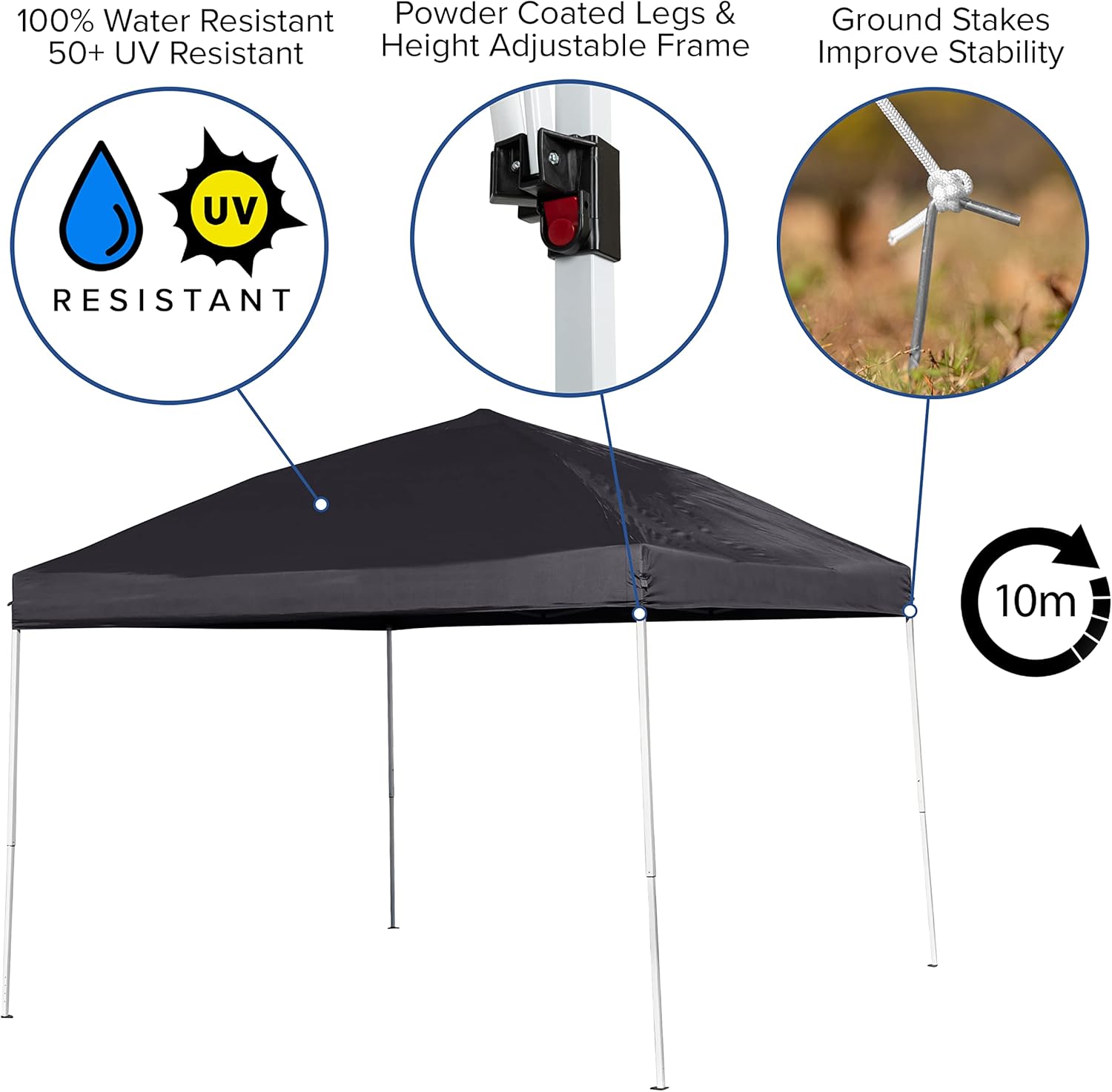 HIGHLIGHTS & BENEFITS: Water resistant polyester fabric top is PU coated and 50+UV-resistant; Solid steel powder coated frame resists rust, corrosion, peeling, or chipping; Includes ground stakes for extra structural integrity