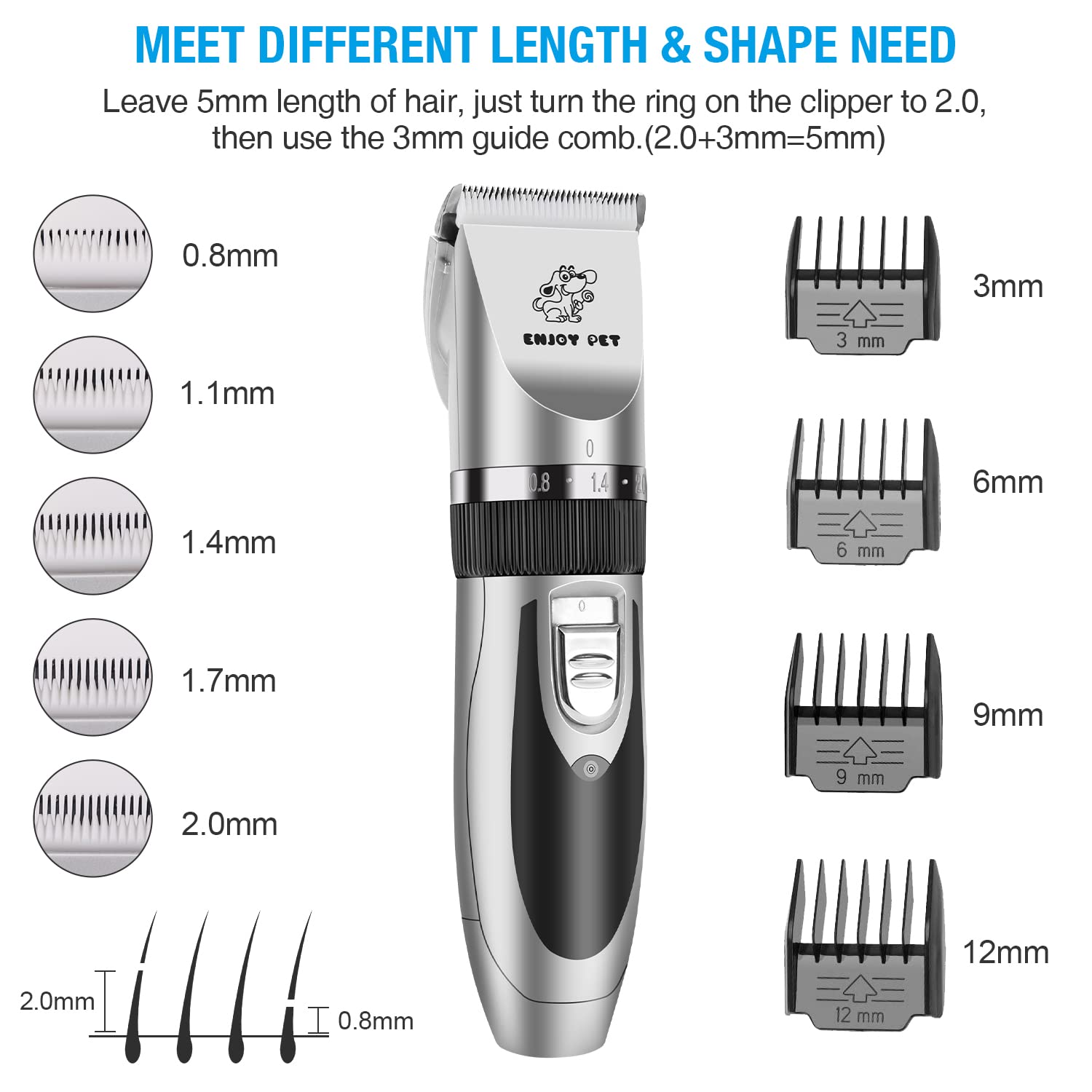 🐱【Professional Dog Clippers】Our dog grooming kit blades are made of 24-teeth titanium ceramic blades combined with ceramic movable blades. They have 5 adjustable blade modes to cater to pets with different hair lengths, ensuring smooth and jam-free cutting. The removable blades are easy to clean and maintain.