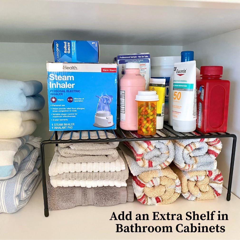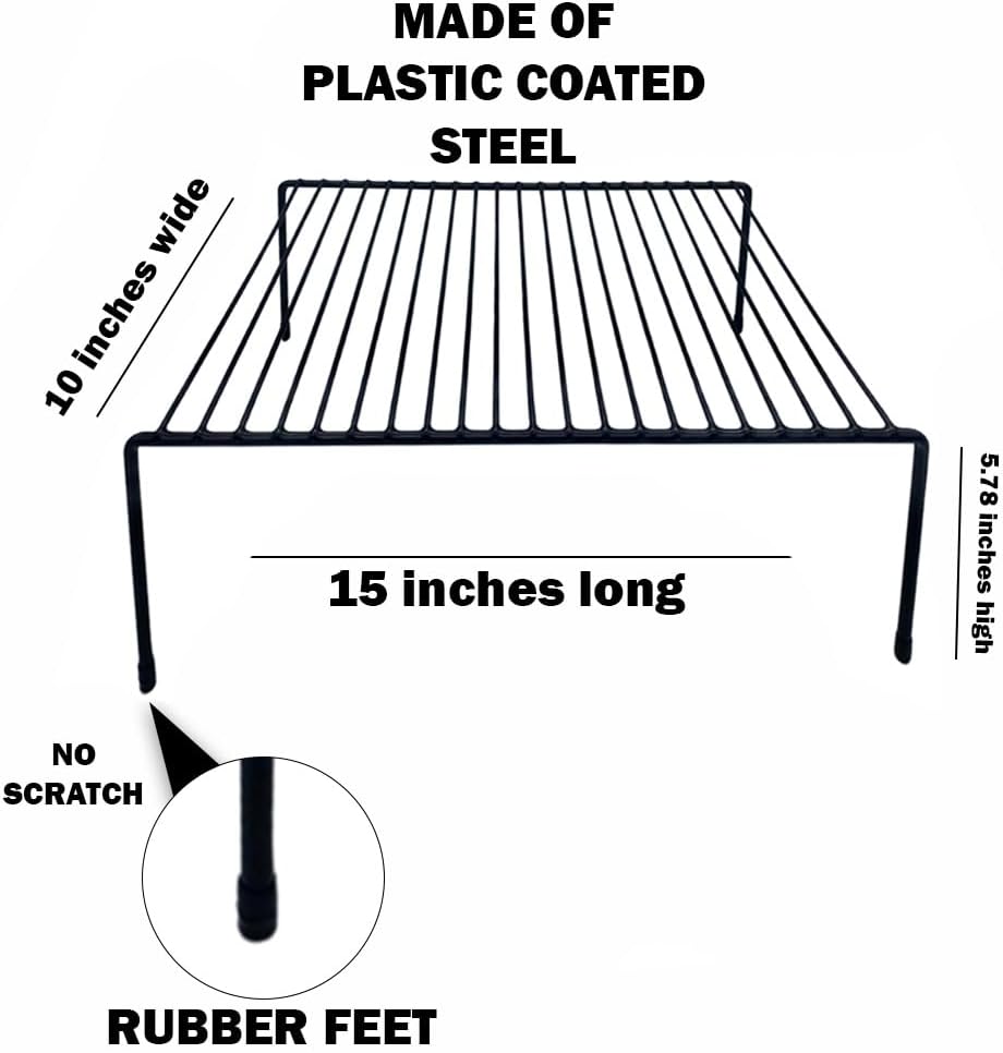 Double your kitchen, bath, or closet storage space! Versatile shelves hold food, dishes, small appliances, pantry staples, cans, toiletries, cleaning products, or anything you need to store in a small space. Perfect for maximizing storage and organizing in kitchen cupboards, pantries, bathroom cabinets, closets, countertops, under a sink, or anywhere you need extra room. Simply place shelves where needed, no installation or hardware required. When it’s time for a new arrangement, shelves can be moved or removed with no damage to original cabinets or cupboards. Sturdy and durable shelves are made of steel with a black PE coating that cleans easily and won’t rust or scratch delicate items — these shelves will be around for the long haul. Plastic feet keep shelves in place and won’t scratch surface underneath. Features a lightweight design for easy maneuverability and a tasteful, classic finish that matches any decor. Each measures approximately 15 Inches Long x 10 Inches Wide x 5.78 Inches Height.