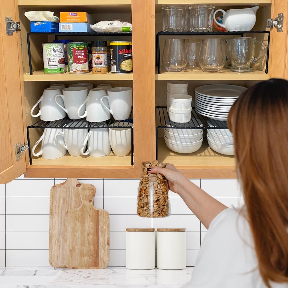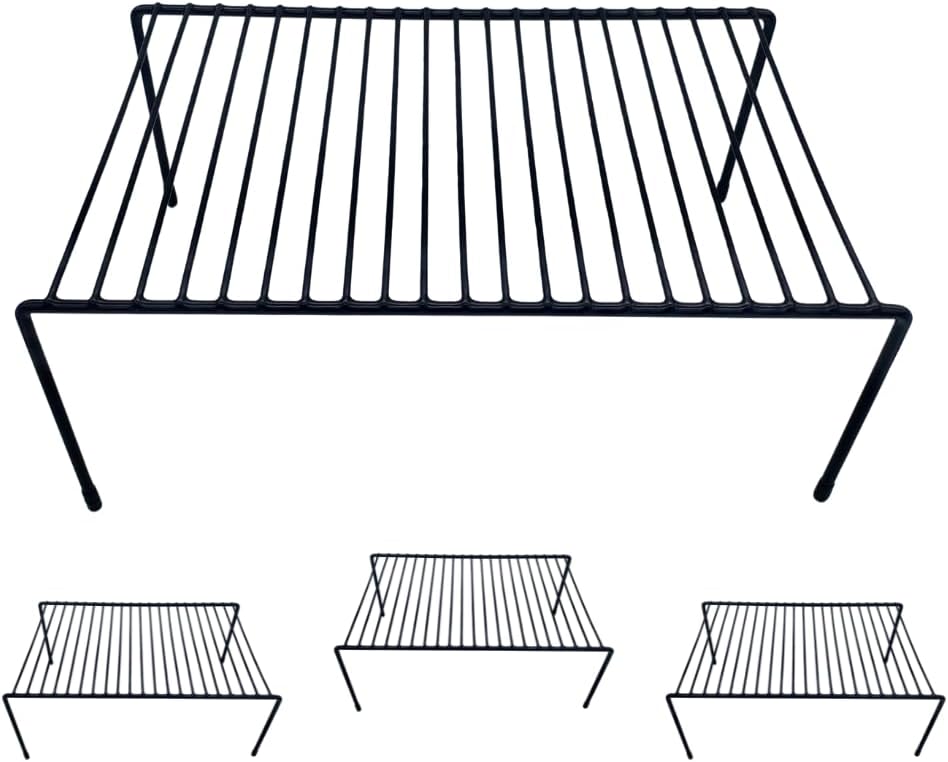 Extra SHELF: Evelots Black Set of 4 wire shelves provides an instant solution for EXTRA storage space. Don’t let valuable cabinet shelf space go to waste when you can maximize it. Doubles your space and helps you organize your life. These sleek cabinet shelf organizers are ideal for decluttering and organizing spices, food, dishes, appliances, cleaning products, and more in any cabinet or cupboard. Large size measures 15 Inches Long x 10 Inches High x 5.78 Inches Tall.