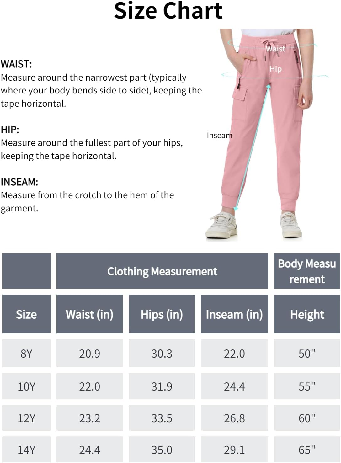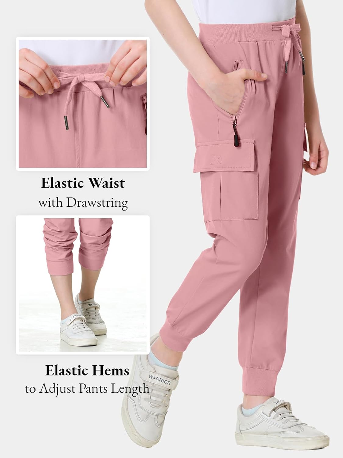 EXARUS Girls Cargo Pants Joggers Slim Fit with Zip Pockets Kids Quick Dry Lightweight Drawstring High Waisted 8-14Y
