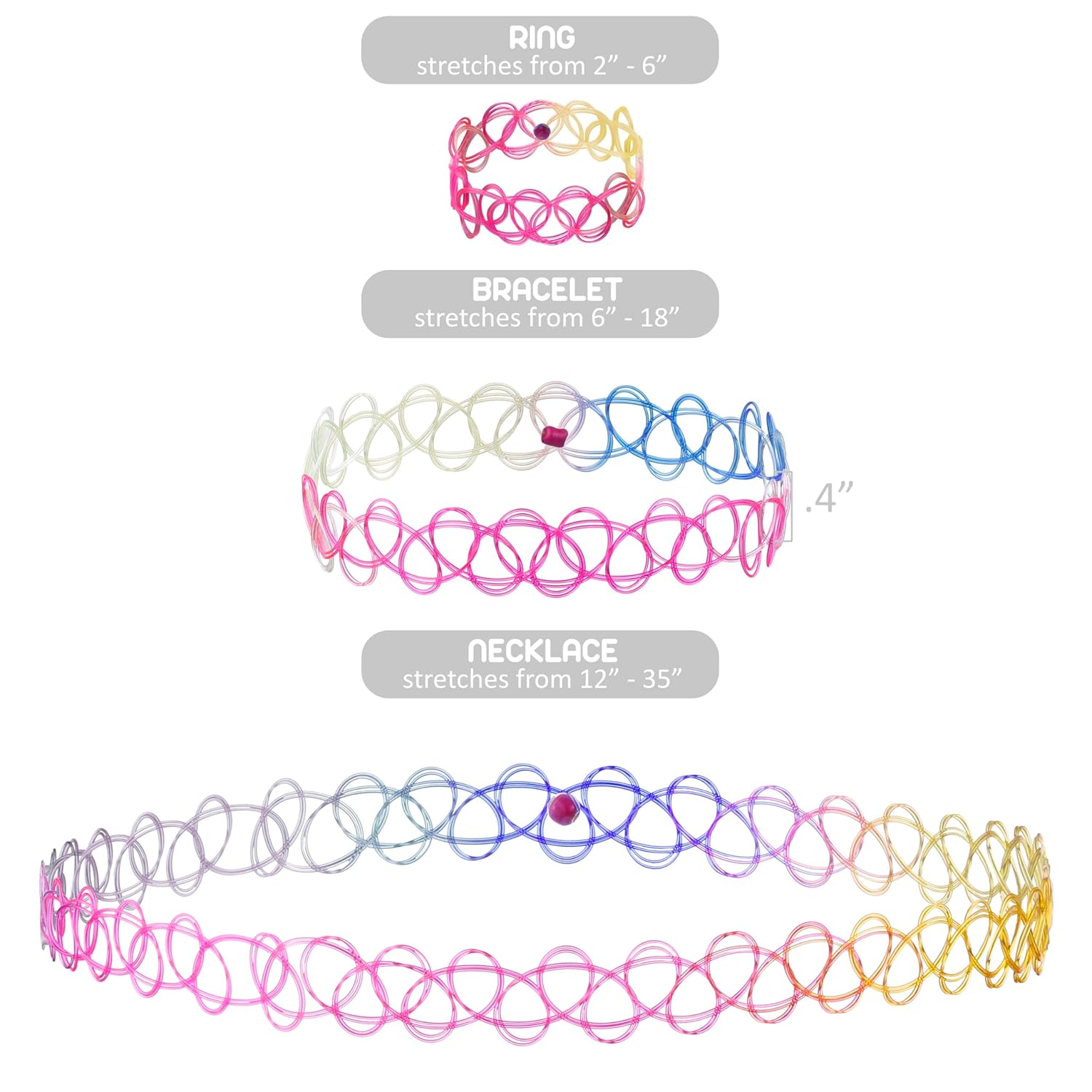 3-Pack Beaded Tattoo Jewlery Set – This set of ombre rainbow tattoo jewelry includes 1 choker necklace, 1 bracelet, and 1 ring, all adorned with colorful beads