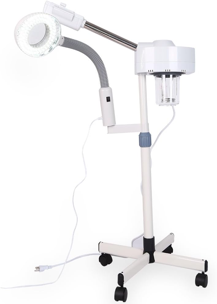 This LED light magnifier lamp swivels 360 degrees around to the light to stay exactly where you move it! No wobbles, no worries, rotatable hot steam outlet,cup removable,the adjustable neck pivots in any direction where you need it to be,heat up quickly,height adjustable and can be move around the salon with wheels,360 degree rotated nozzle