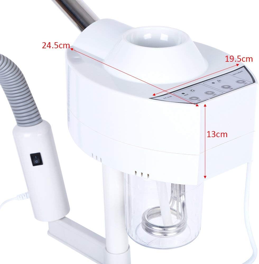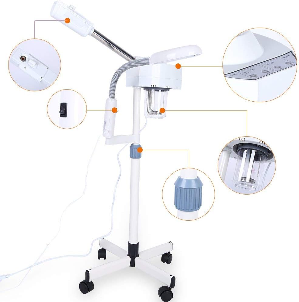 Easy to operate: rotatable hot steam outlet,cup removable,the adjustable neck pivots in any direction where you need it to be,heat up quickly, height adjustable and can be move around the salon with wheels, 360 degree rotated nozzle, you can conveniently moisturize your face, neck, shoulder, arm,back, legs when you are sitting or lying.