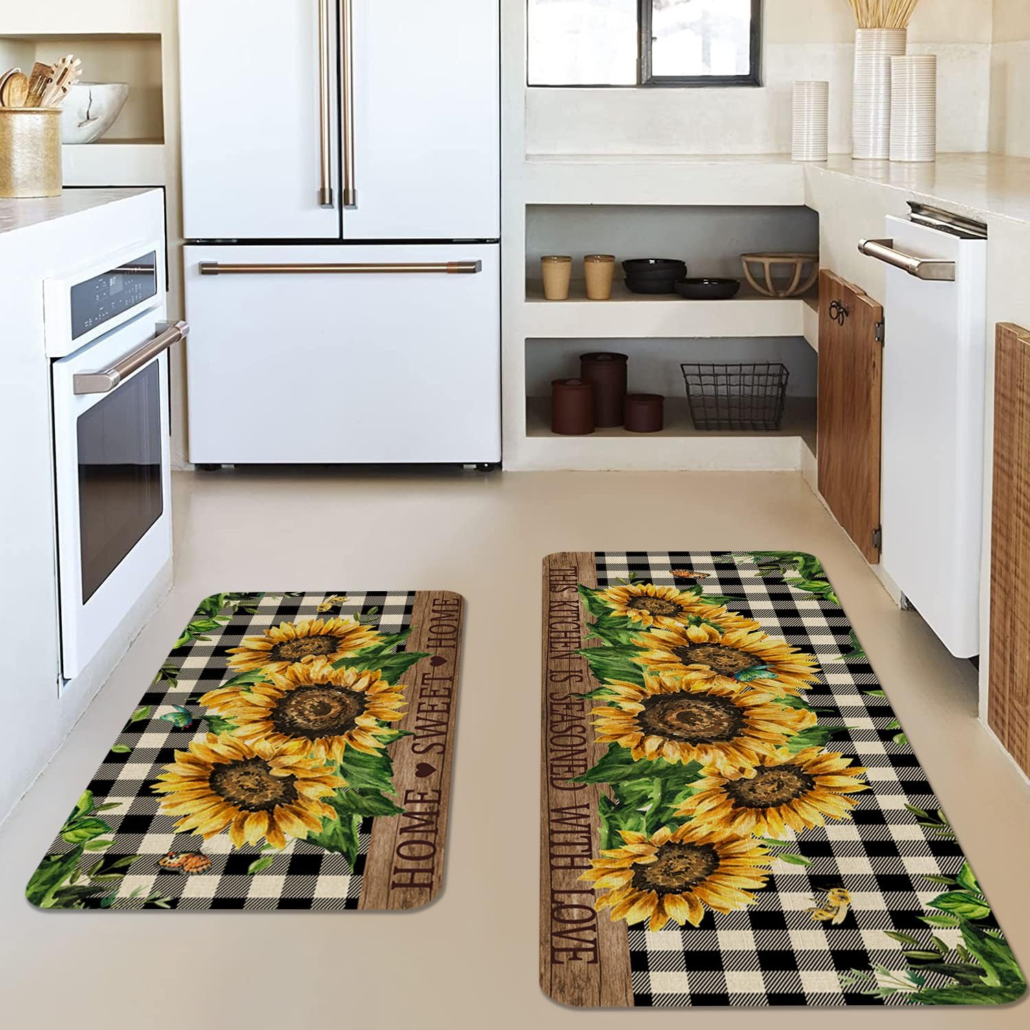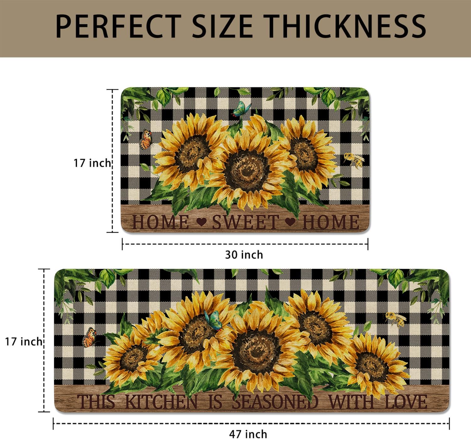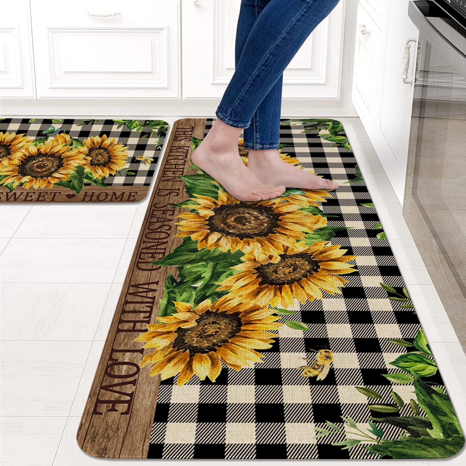 Faptoena Sunflowers Kitchen Rugs Set of 2,Home Sweet Home Buffalo Plaid Holiday Kitchen Mats for Floor,Spring Summer Seasonal Non-Slip Washable Sink Mat Home Decor Doormat+Runner Rug