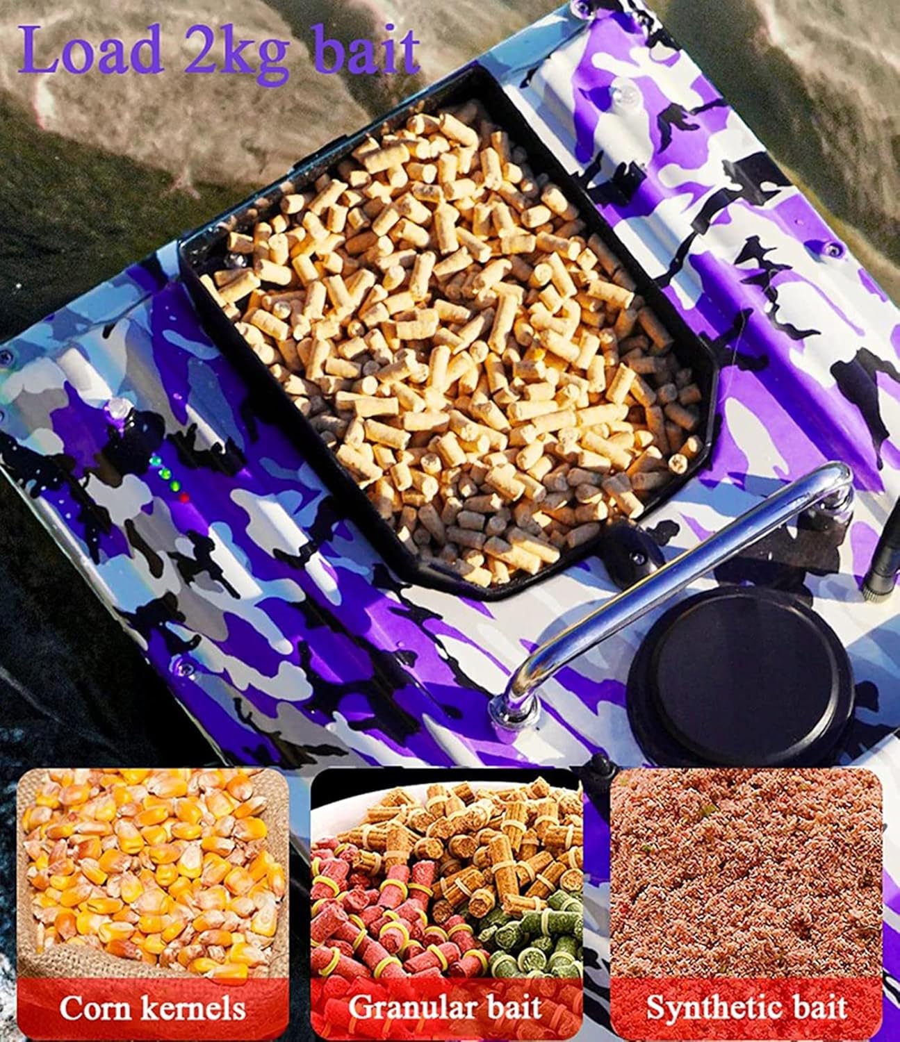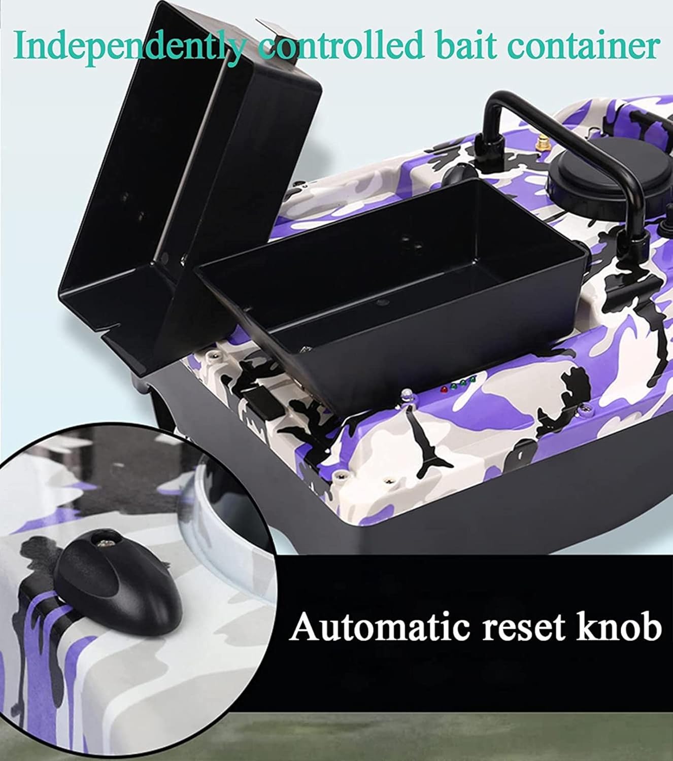 (Independent fish bait container): The RC bait boat has 2 independent bait containers that can absorb 2.0 kg of different baits such as corn welds, pellet bait and mixed bait, etc. The rear bait container has an anti-entertainment design. This makes it easier to wear fishing hooks and fishing nets and significantly improve fishing efficiency.