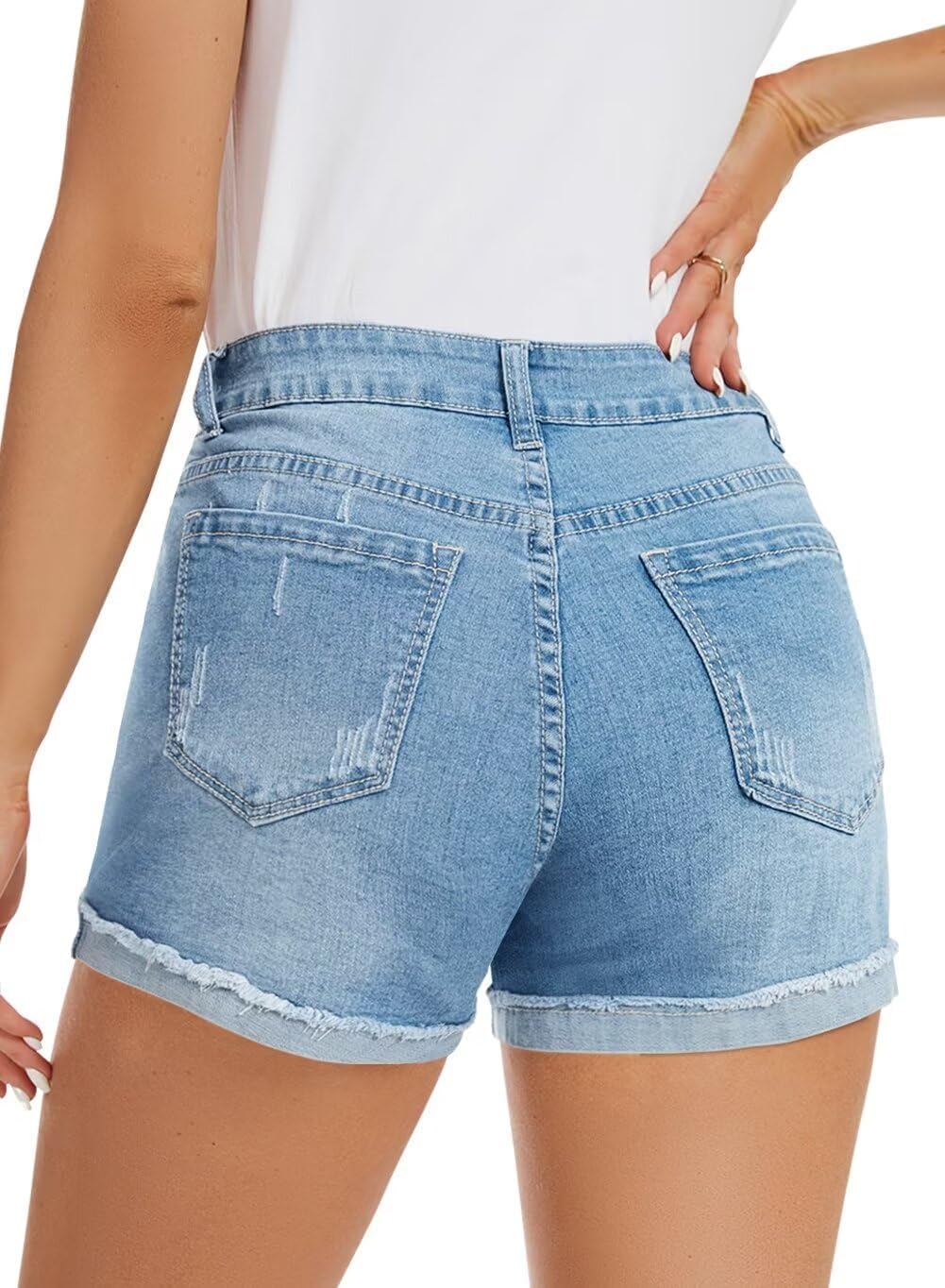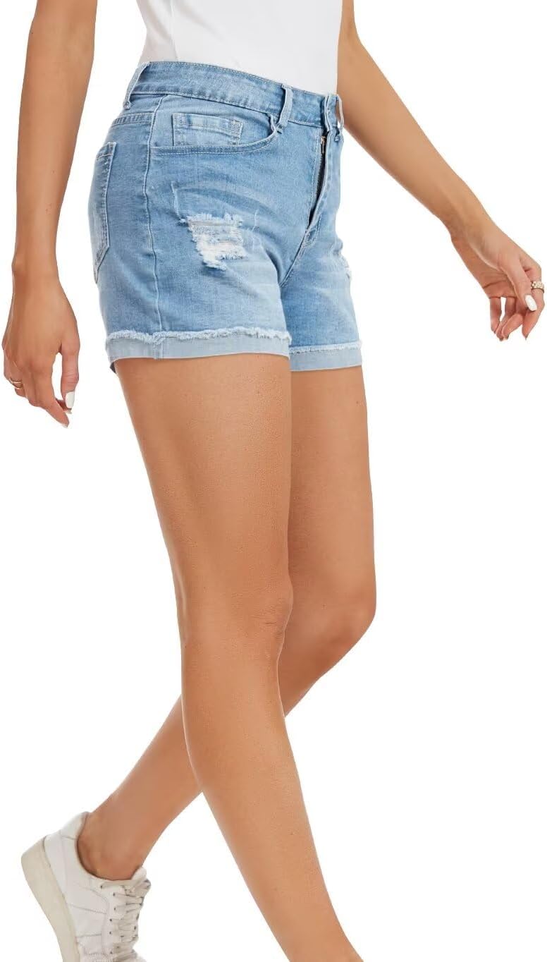 FEKOAFE 2024 Womens Casual Mid/High Waisted Denim Shorts Summer Stretchy Ripped Jean Shorts for Women