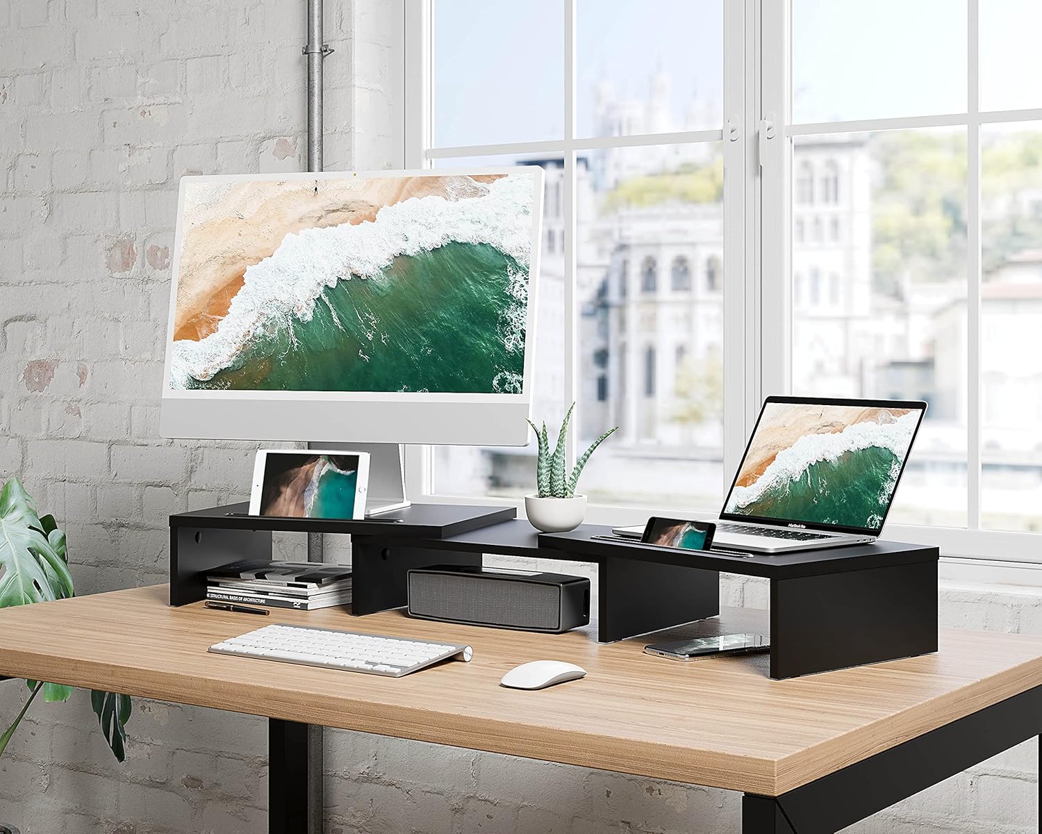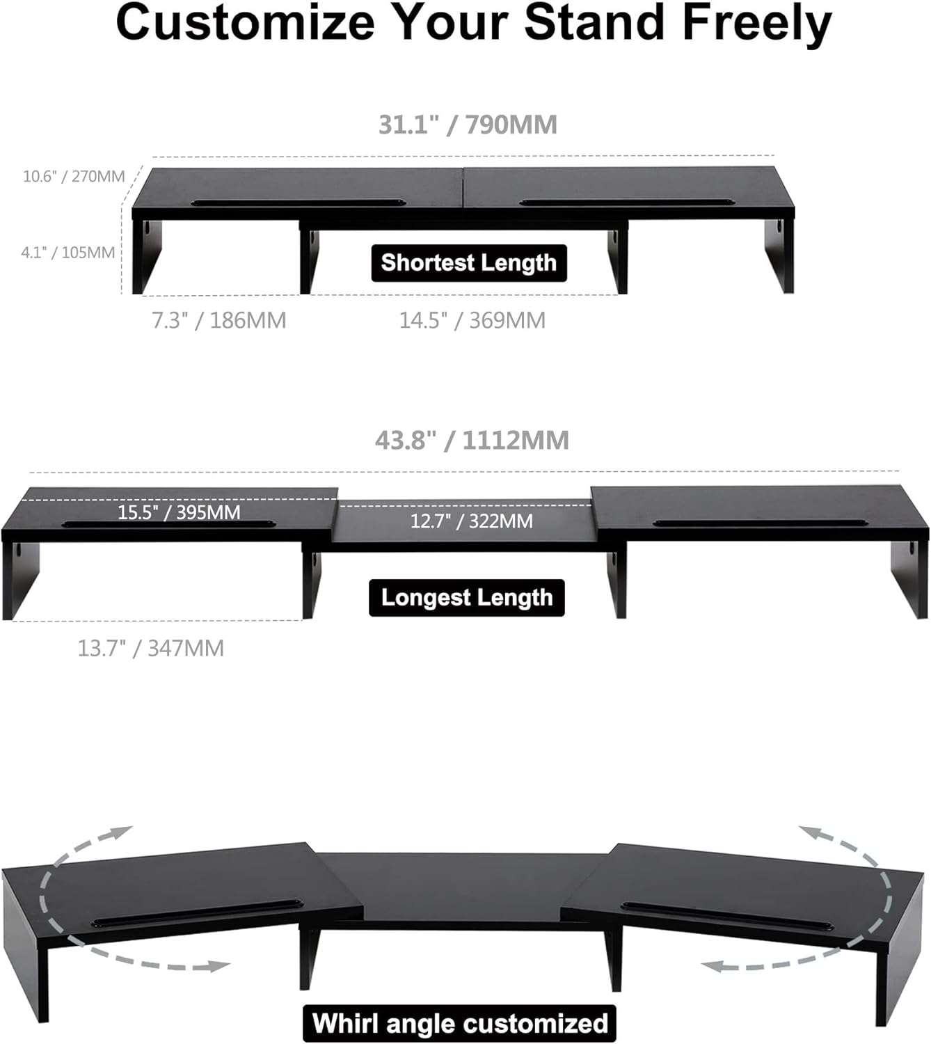 【Longer Size with More Space】At longest 42.7inch wide, this laptop riser is big enough to support two monitors. Depending on your setup, you may even have room to place a speaker or another device in the middle. Creates enough space underneath for smaller desk essentials, or to tuck your keyboard and mouse away.