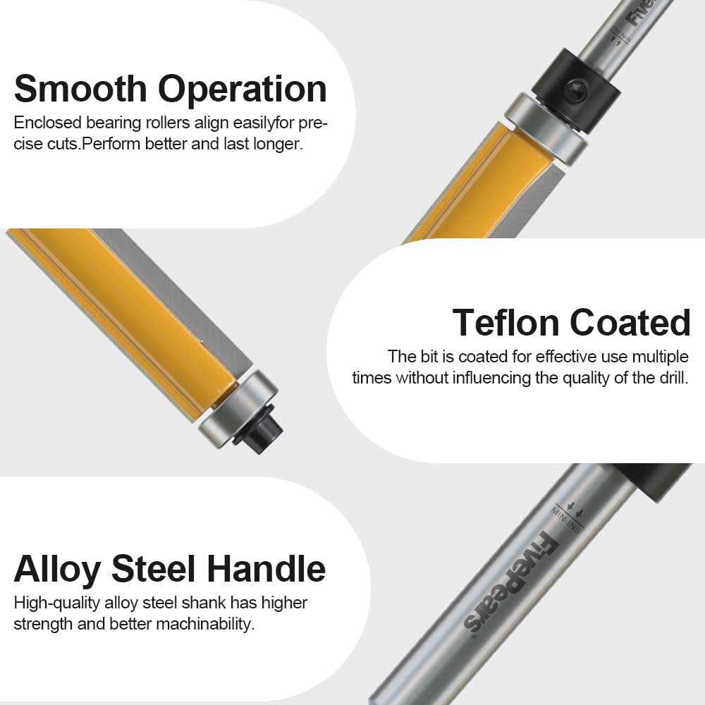 FivePears Top and Bottom Bearing Flush Trim Router Bit 1/4 Inch Shank, 1/2 Inch Cutting Diameter, 1-1/4 Inch Cutting Length