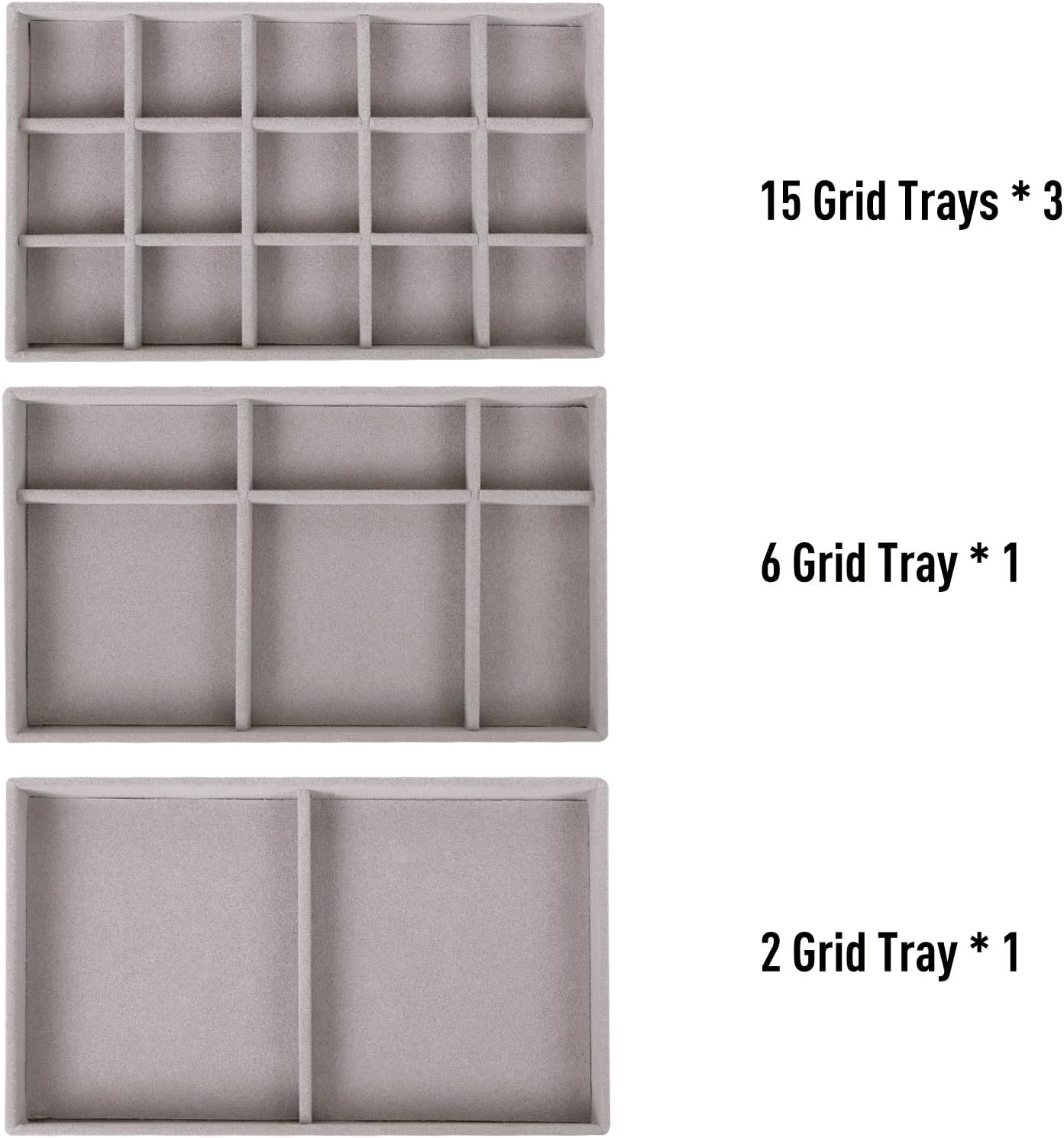 Customized & Stackable – All dividers in the velvet tray can be removed to suit your individual storage needs; the 4 non-slip pads on the bottom of the box can be stacked in the 4 grooves on the top, and you can stack 2 boxes or more.