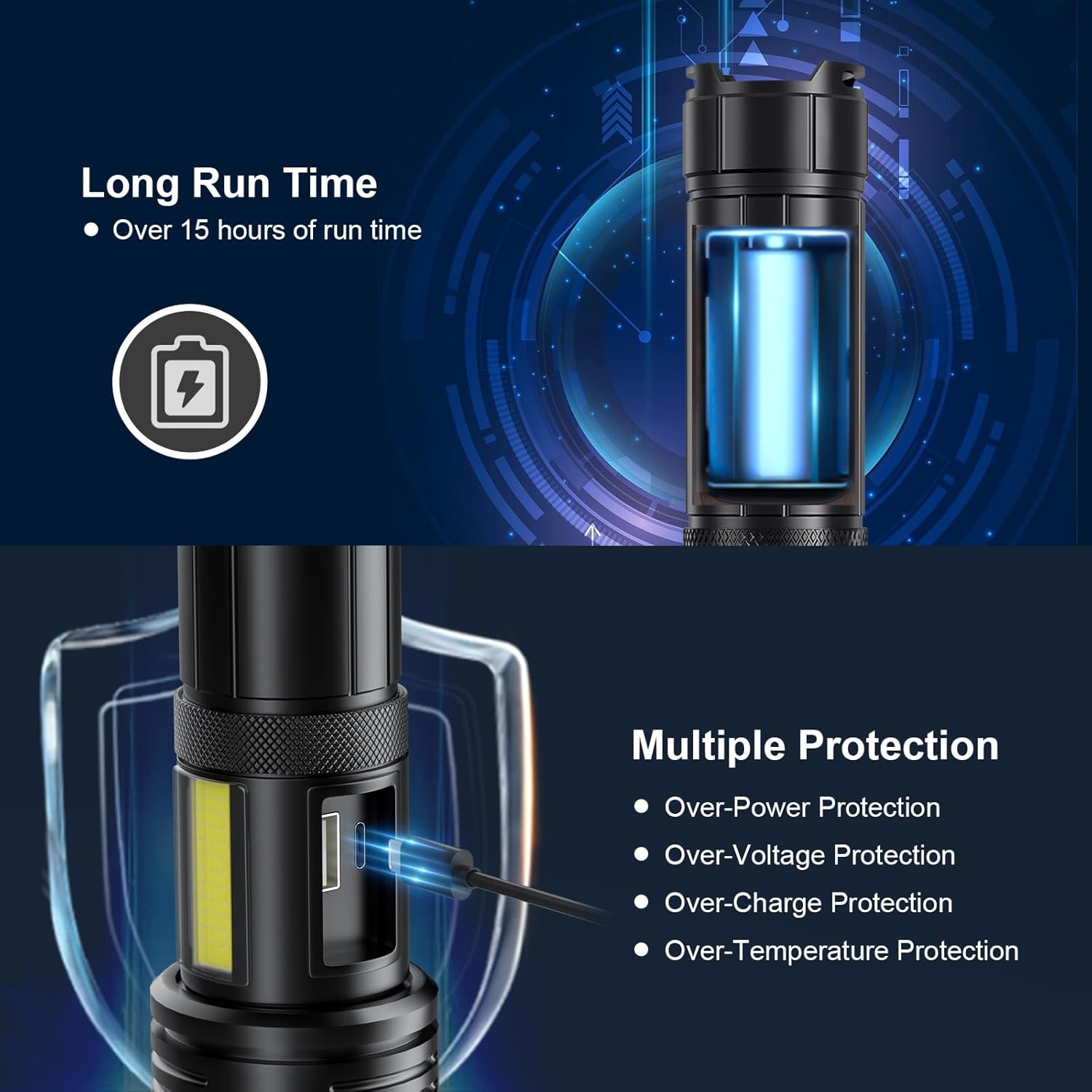 【990000 LUMENS FLASHLIGHT】Our flashlights high lumens is equipped with a upgraded chip, offering a 30% performance improvement. The flashlight has an astonishing output power of up to 990,000 lumens, which is 20 times brighter than a regular led flashlights high lumens