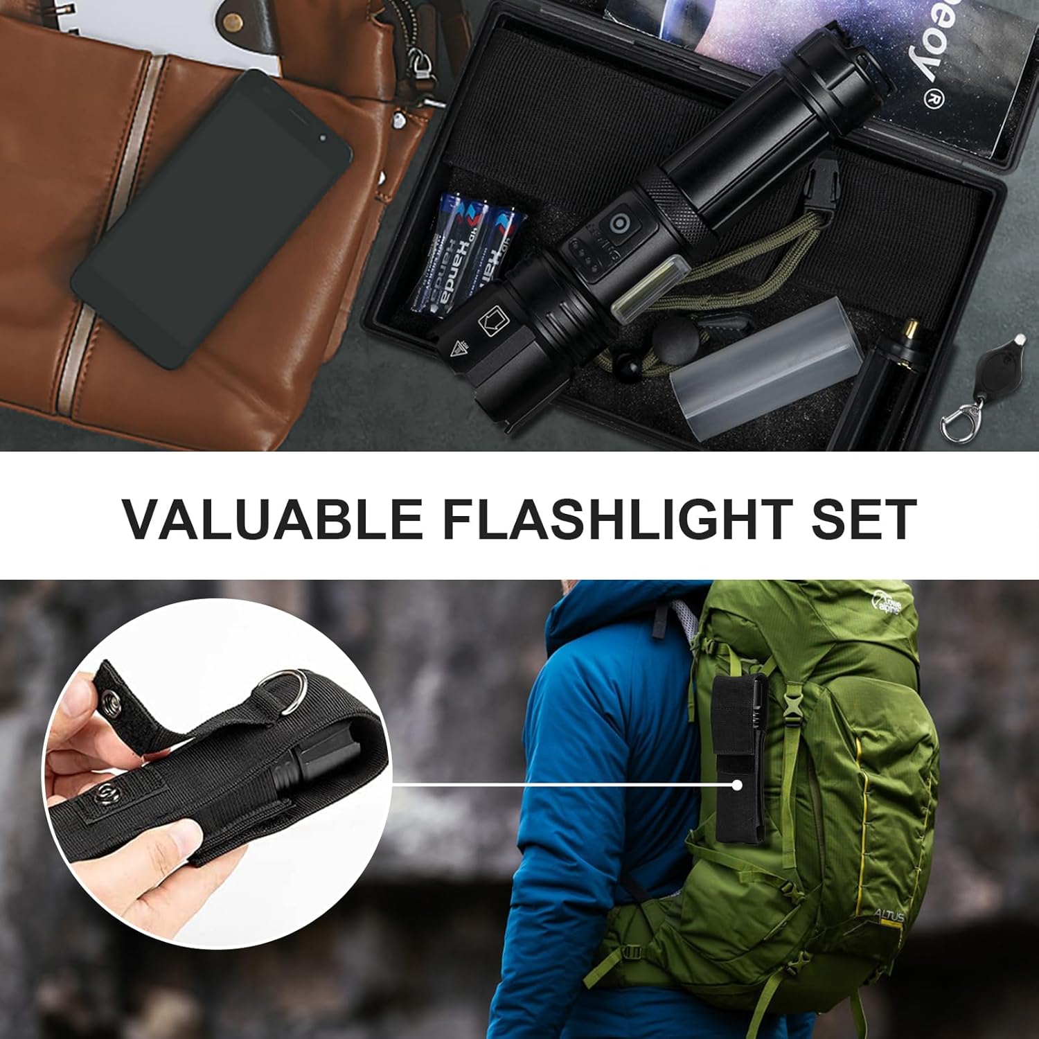 【IPX7 WATERPROOF & DROP PROTECTION】 Our waterproof flashlights feature advanced sealing technology that keeps them water-resistant, you can boldly navigate through rain, storms, and any challenging weather conditions.This high power flashlight is constructed from strong aluminum alloy, and it has undergone rigorous testing, able to withstand accidental drops of up to 23Ft
