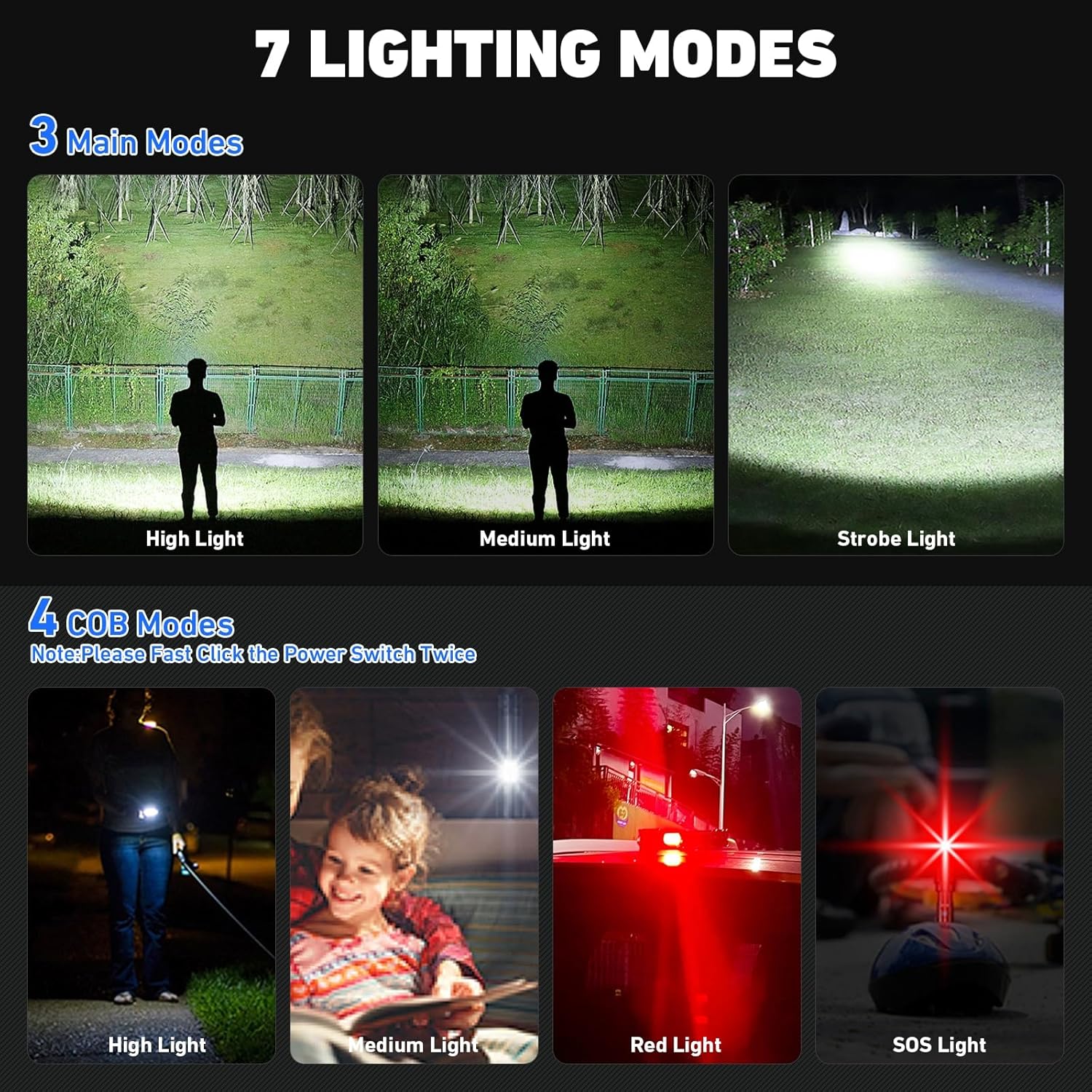 【7 MODES & BEAM ADJUSTABLE】Our powerful flashlights has 3 main light modes (high, medium, strobe) and 4 sidelights modes (high, medium, red light, red flashing light). With adjustable beam settings, you can switch between a light for long-distance visibility or a wide beam for a broader field of illumination