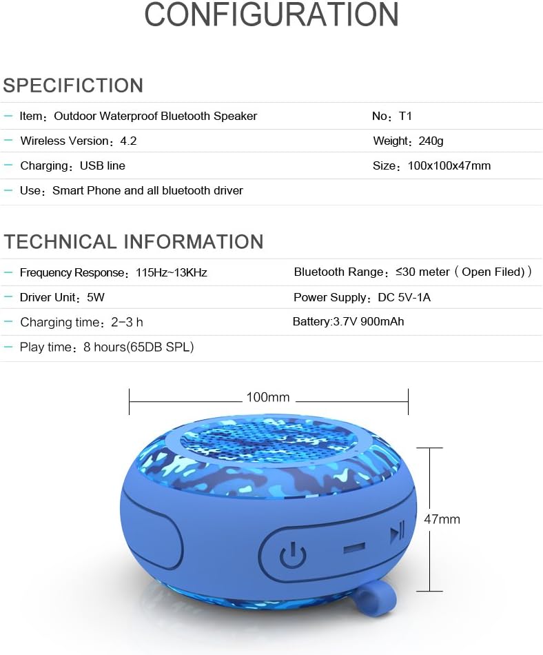 【COMPETELY WATERPROOF】 IP67 Excellent choice to use around pool, beach, bath, boat, car &golf cart and all water environments. It can be submersed underwater in 3 feet of water, for 30 minutes, without issue. Note: The sound can’t out when the speaker holes full of water, please pour out the water from the hole)