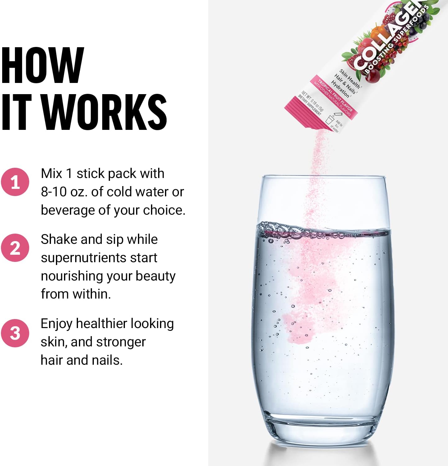 DELICIOUS & CONVENIENT: Add some refreshment to your daily beauty ritual, and say goodbye to messy collagen powder or slimy biotin gummies. Collagen Boosting Superfoods Stick Packs are bursting with fruit flavor, perfect for on-the-go convenience.