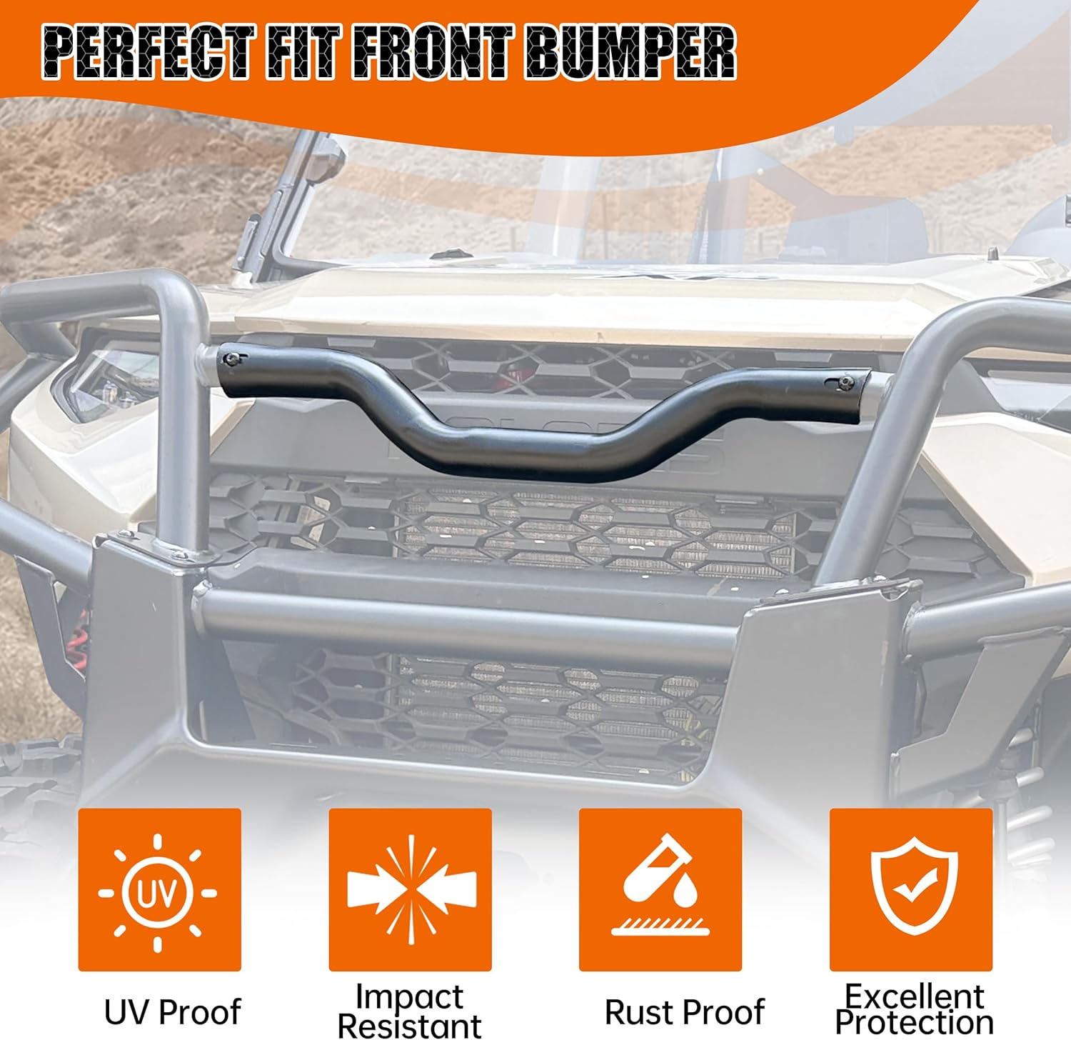 Made of heavy duty iron with black powder coating, corrosion resistant and sturdy. Keeps the front bumper stable, as well as can prevent debris and branches from damaging the front of the vehicle.