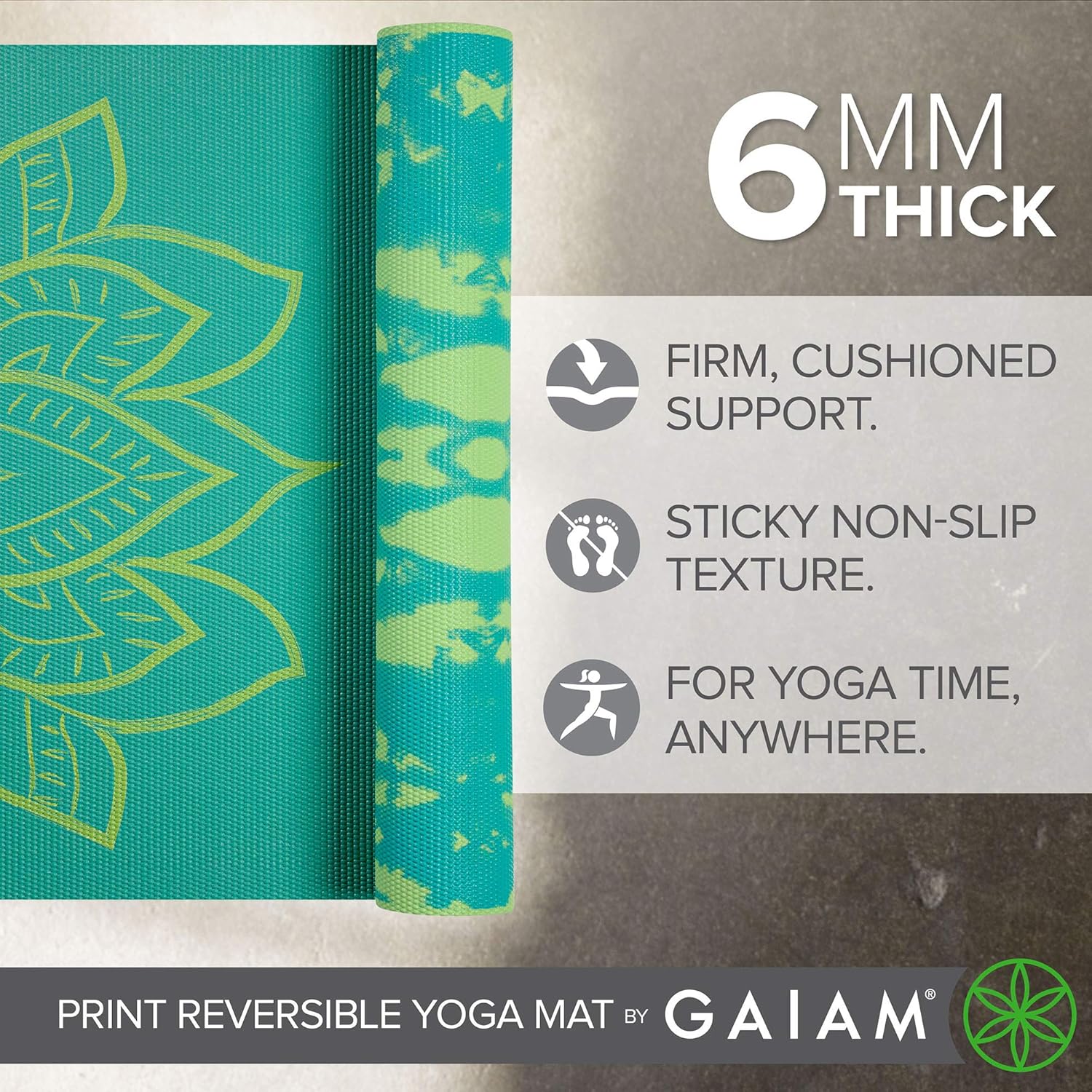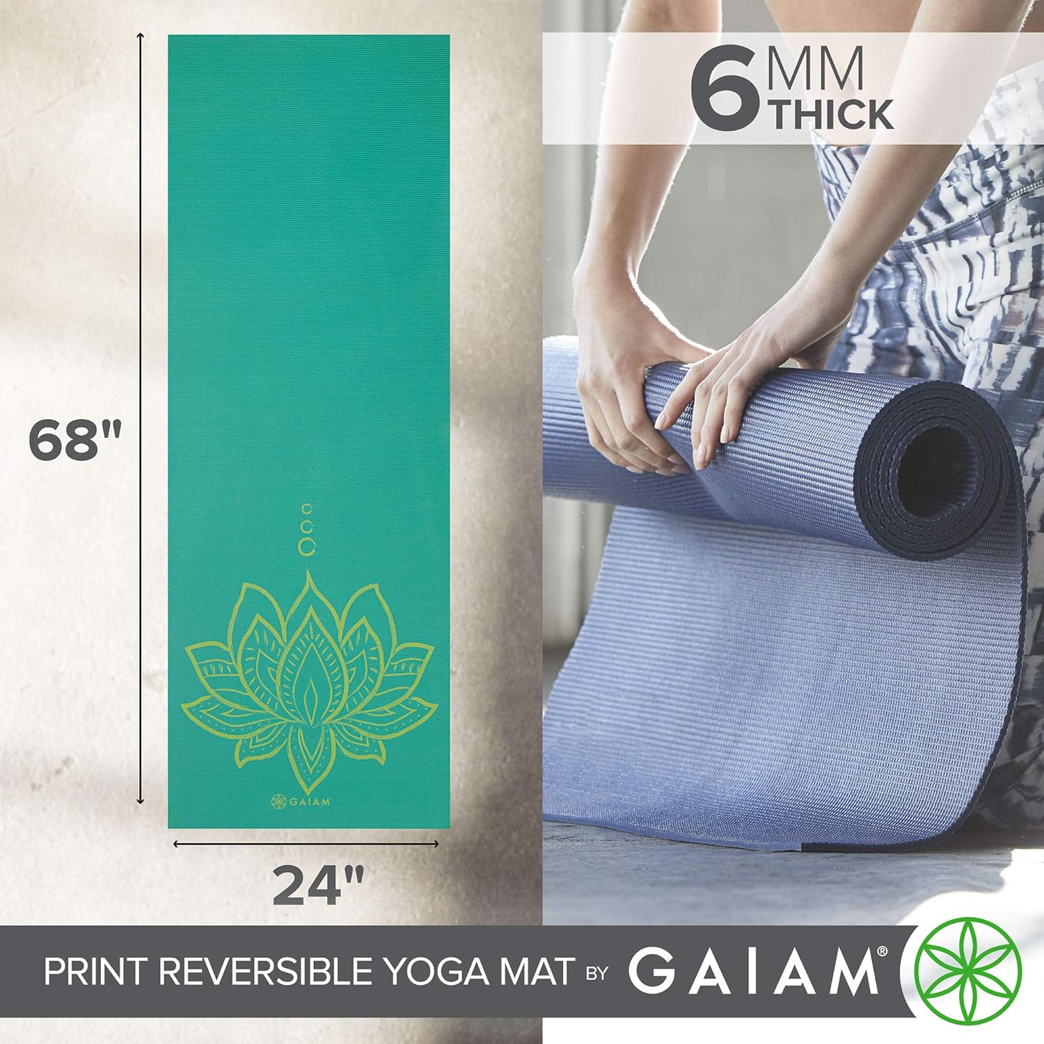 Gaiam Yoga Mat – Premium 6mm Print Reversible Extra Thick Non Slip Exercise & Fitness Mat for All Types of Yoga, Pilates & Floor Workouts (68″ x 24″ x 6mm Thick)