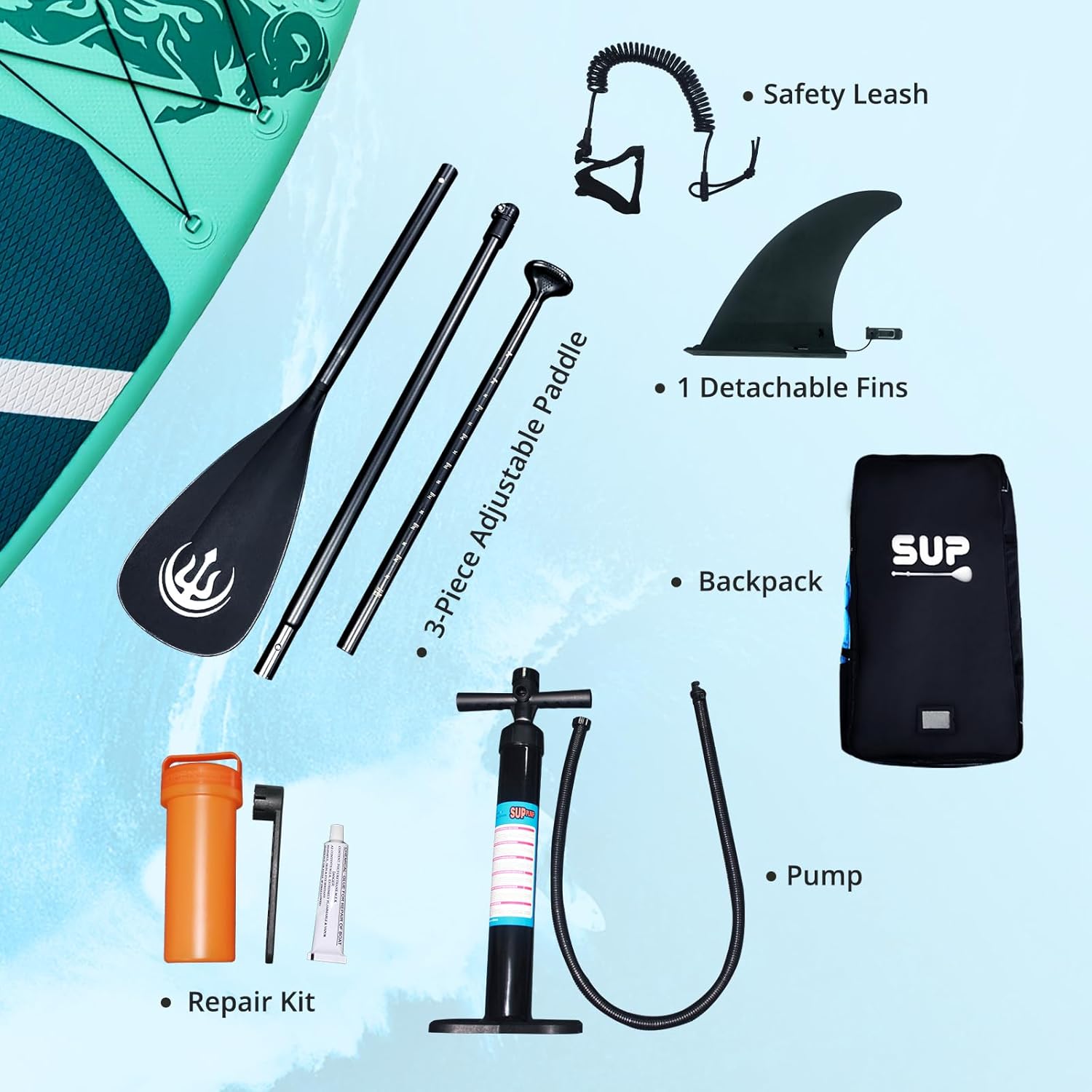 [Complete SUP Kit]: Dive into your aquatic adventures immediately with our comprehensive package that includes an adjustable paddle, detachable fins, safety leash, manual pump, SUP backpack, and a repair kit, ensuring you have everything you need for a day on the water.