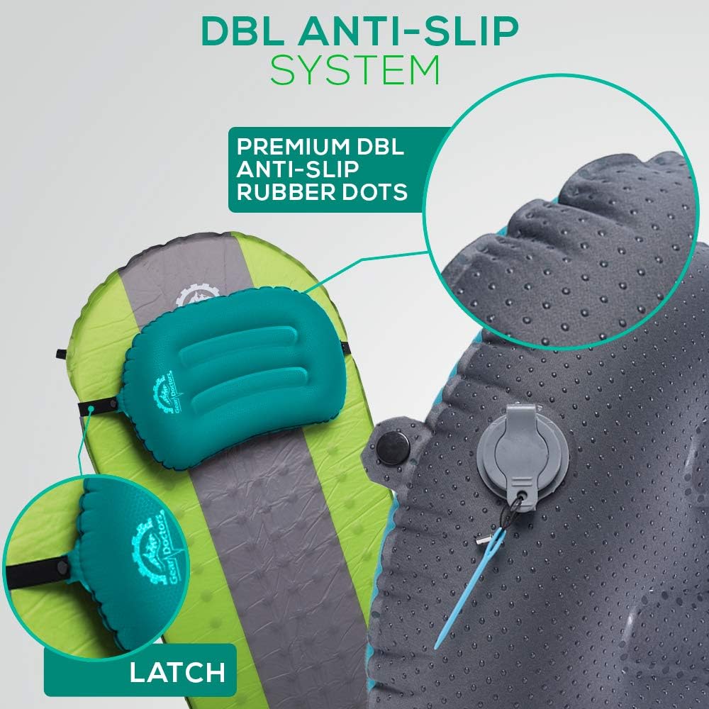 𝐃𝐨𝐮𝐛𝐥𝐞 𝐀𝐧𝐭𝐢-𝐒𝐥𝐢𝐩 𝐒𝐲𝐬𝐭𝐞𝐦: Rubber dots at the bottom fabric make Gear Doctors Camping Pillow stable on any Nylon , Polyester or other slippery sleeping pad fabric , If that is not enough you can use the detachable latch to lettarly tie the pillow to your sleeping pad , or even any car/ office chair , No more sliding noises or waking up to readjust your pillow