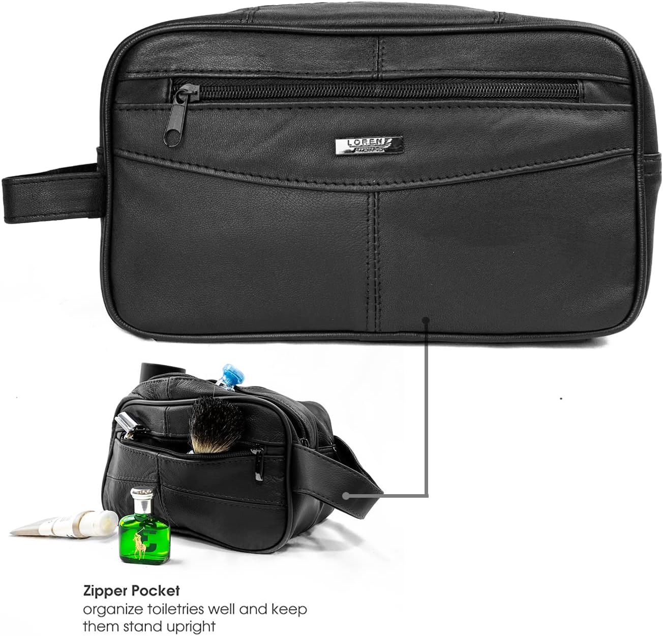 Genuine Leather Mens Wash Bag Toiletry Travel Wash Bag Shaving Bag Bathroom Gym Makeup Organizer Gift for Men & Women, One Zipper Black