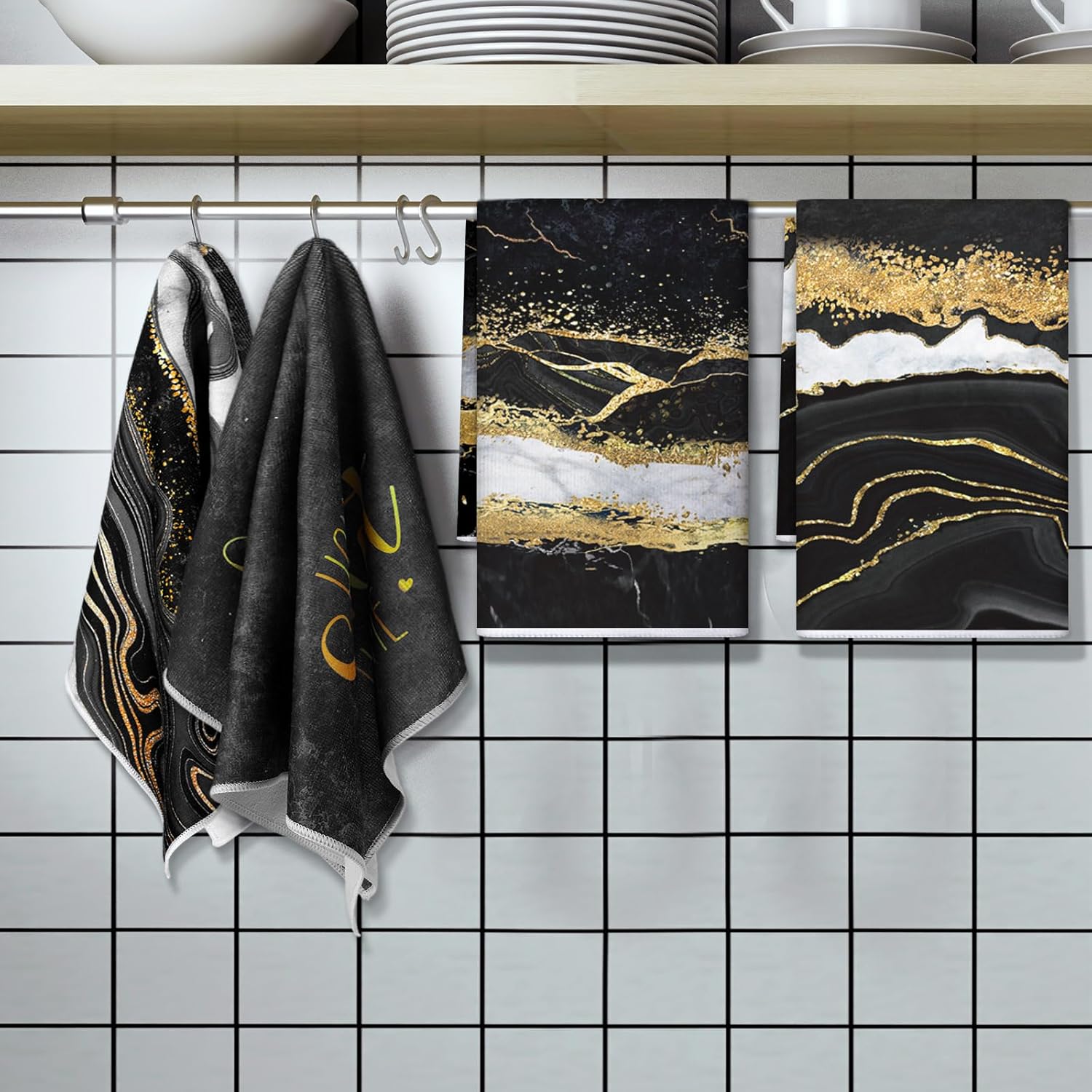 Geyoga 4 Pcs Marble Kitchen Towels Black Blue White Gold Wave Dish Towel Farmhouse Marble Hand Towels 16 x 24 Inch Modern Tea Towel for Summer Christmas Bathroom (Black,Marble)