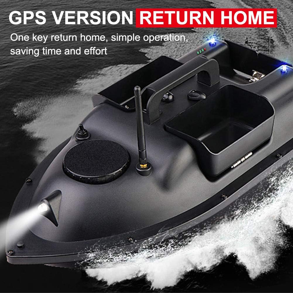 CPS one-key return: LCD two-handed remote control, with cruise control function, remote control of ship lights, hull with power indicator light, three compartments can be independently controlled to open, battery is 7.4V 5200mA, continuous use about 2 hours! The remote control can be set to return to origin point with one key. In addition, you can set 3 arbitrary positioning points, and it can go back and forth between 3 points. After setting the origin, if the signal is disconnected or the battery is low, the ship will automatically return to the origin after 15 seconds, the LCD screen of the remote control will display the power of the boat, the compass and the sailing distance!