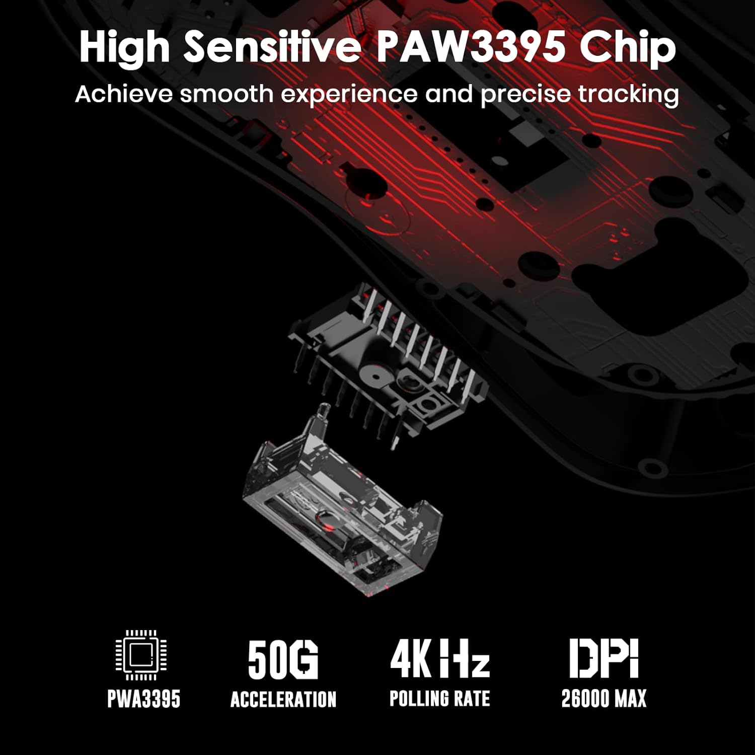 Hyper Precision Sensor: The Art of Unseen Advantage – Dominate the gaming world with a up to 4K polling rate and a staggering 26,000 DPI sensor. PAW3395 provides ultra-smooth cursor movement and pinpoint accuracy, giving you the unseen advantage in every skirmish, every battle.