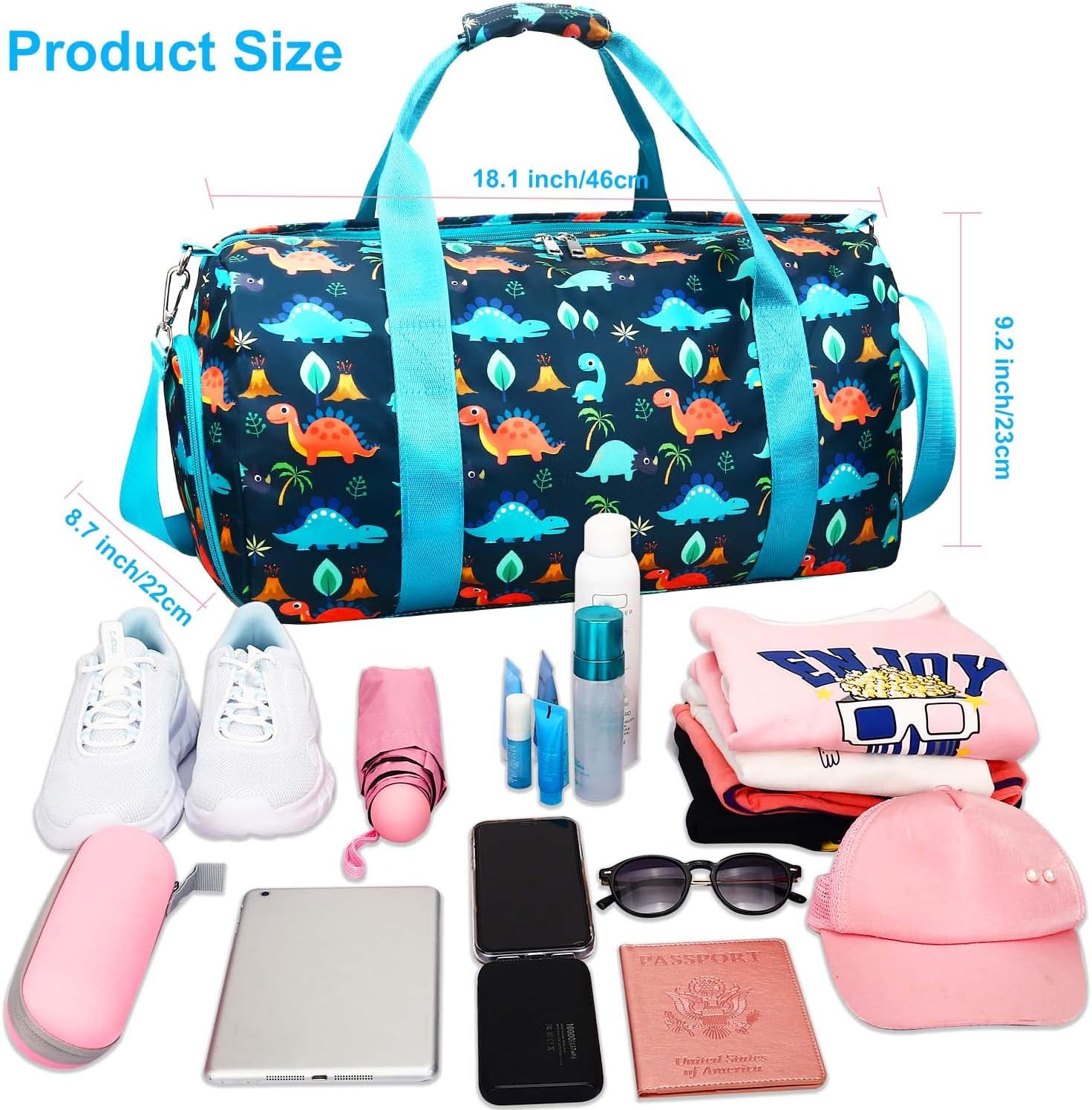 【Lightweight&Multi Compartment】Girl Kids Travel duffle Bag, 18.1 x 9.2 x 8.7 inches,1 main compartment with 1 inner zipper pocket, 2 interior open pockets, 1 large wet compartment,1 side pocket, and 1 separated shoe pocket. Different sizes pockets are enough for you to hold your items like 14″ or under laptop, iPad, A4 files, books, umbrella, sunglasses, cosmetics,phone , keys ,passports ,uniform, shoes, water bottle ,snacks plus her pompoms and other daily things.