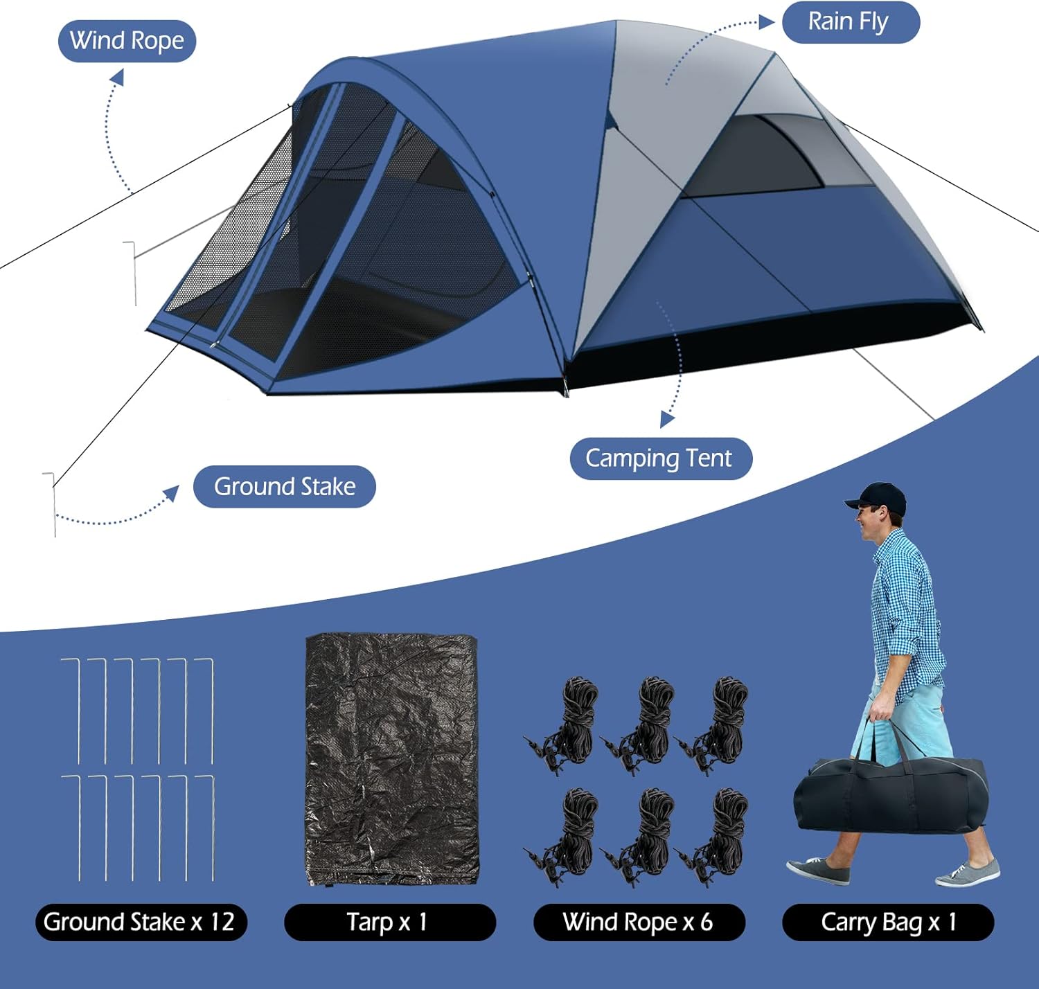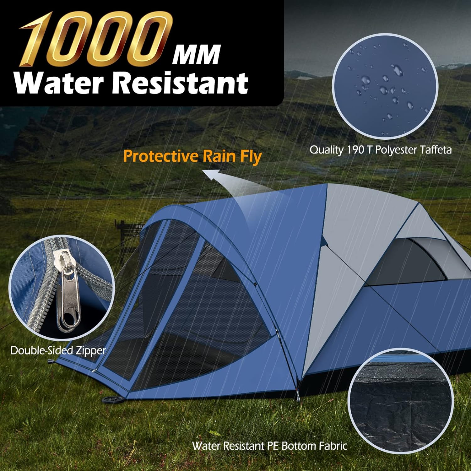 🏕️【Roomy Space for 6 People】Measuring 10′ x 10′ x 6′(L x W x H), this dome tent easily accommodates 6 people, allowing your whole family to enjoy the nature together. Moreover, the front porch room with mesh cover, brings extra bug-free lounging space and extra space to put luggages, ensuring a sperate sleeping room.